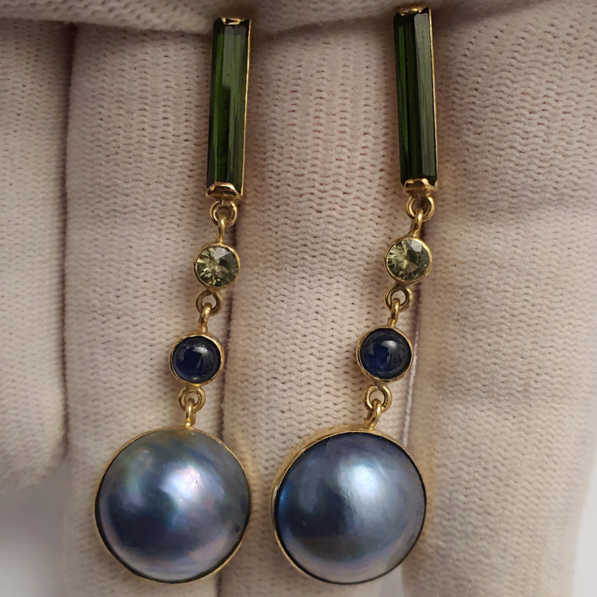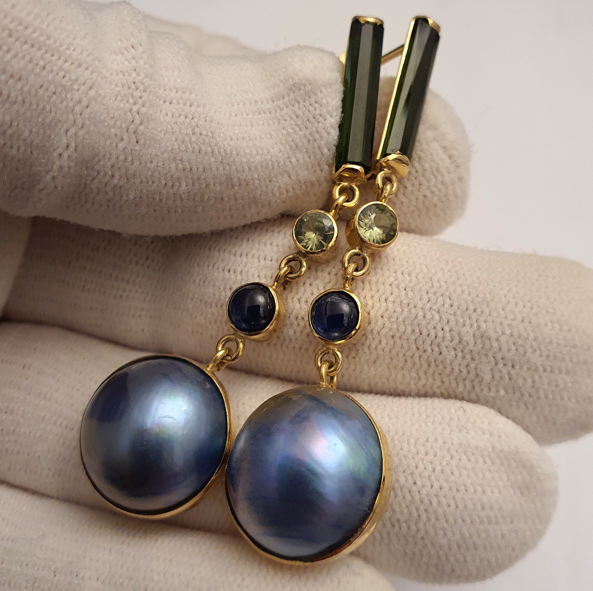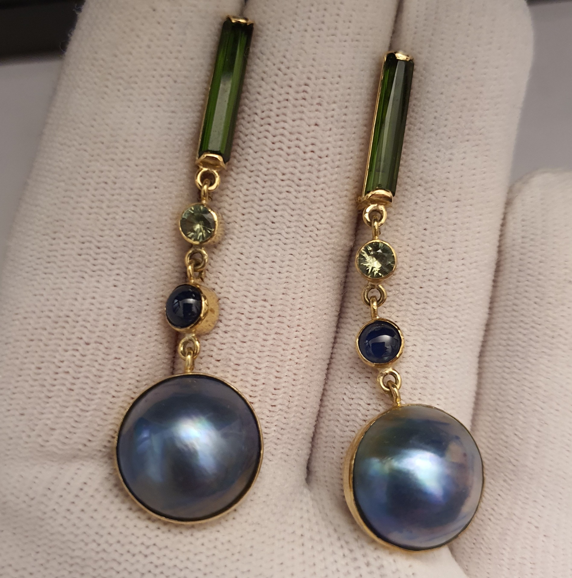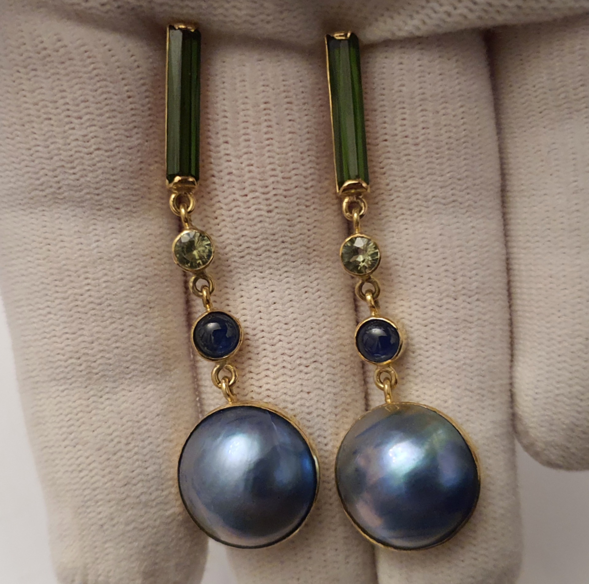 cercei unicat, realizati manual din aur galben 14k, in greutate de 9.34 grame, ornati cu doua turmaline naturale verzi de calitate superioara, mari de 17.5x3.5mm si 3.27 carate, cu doua safire naturale verzi rotunde de 4.5mm si doua safire naturale albastre de 5mm, tratate standard (doar termic), totalizand 1.88 carate, si doua perle naturale mabe, gri cu tonuri de roz, verde si albastru, culori induse in timpul cresterii, mari de 15mm si 16.63 carate; dimensiuni cercei: 60x16mm