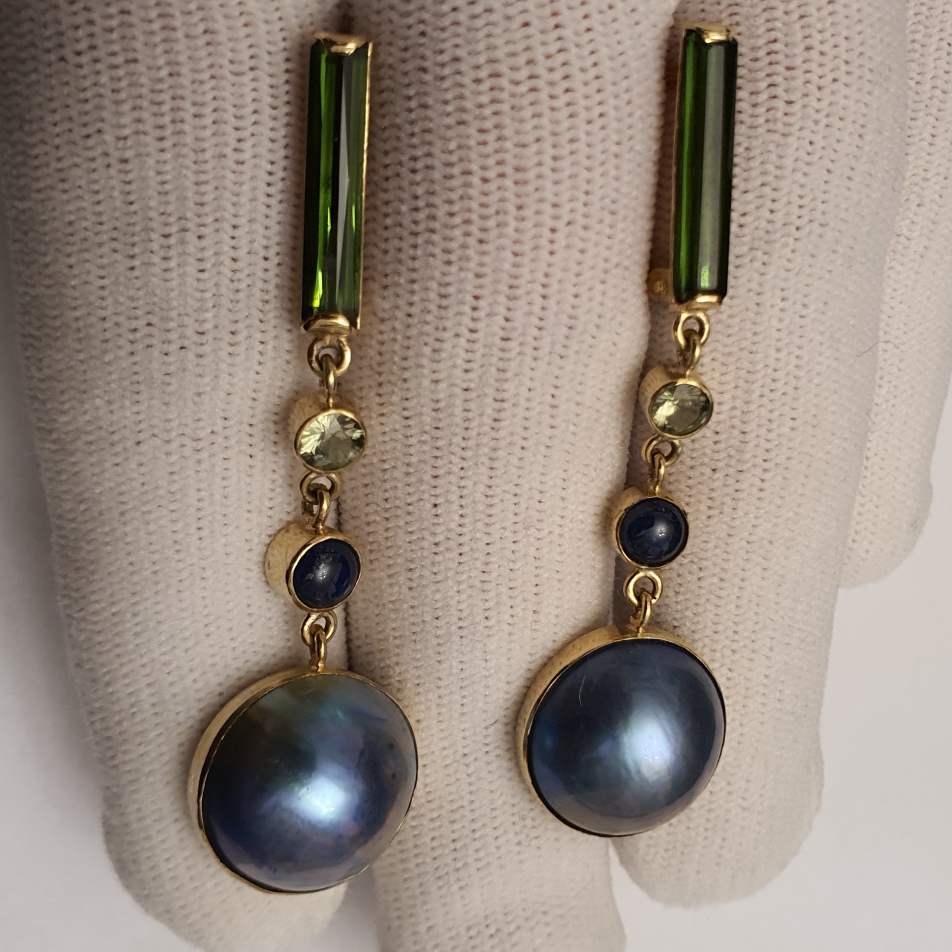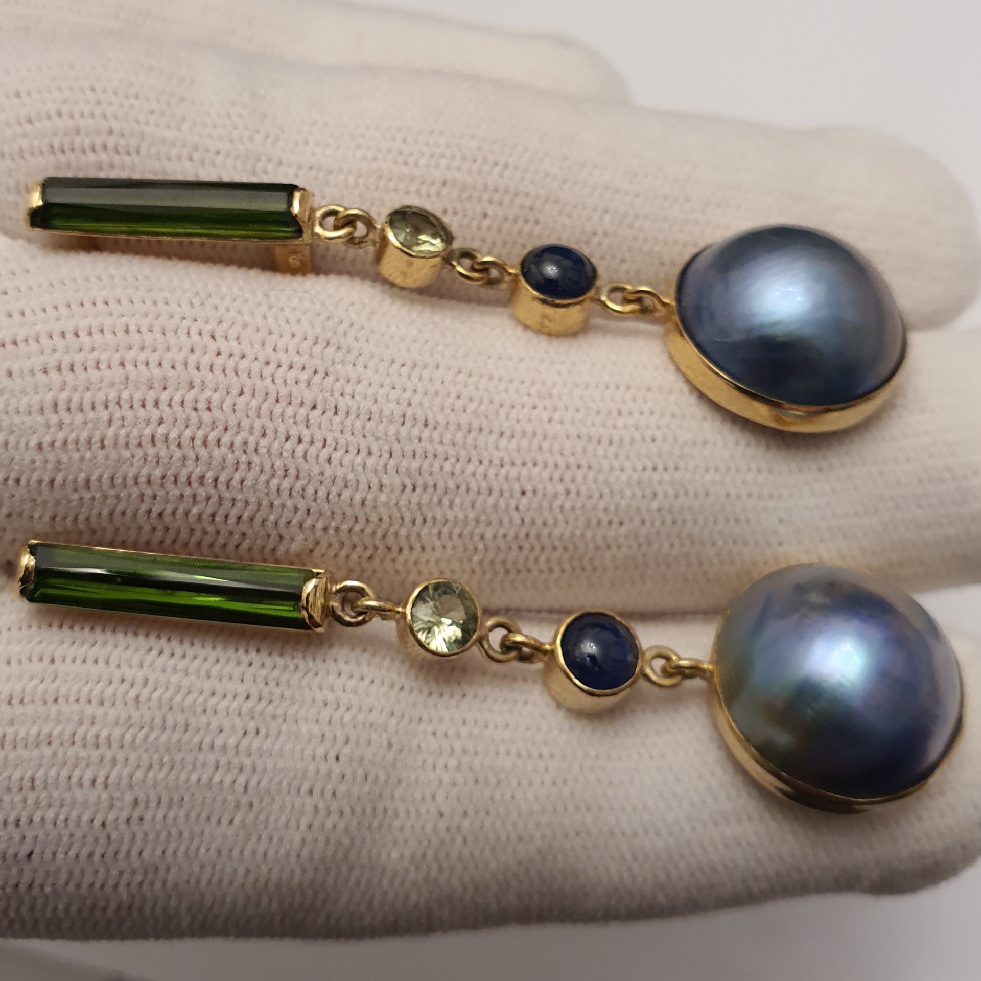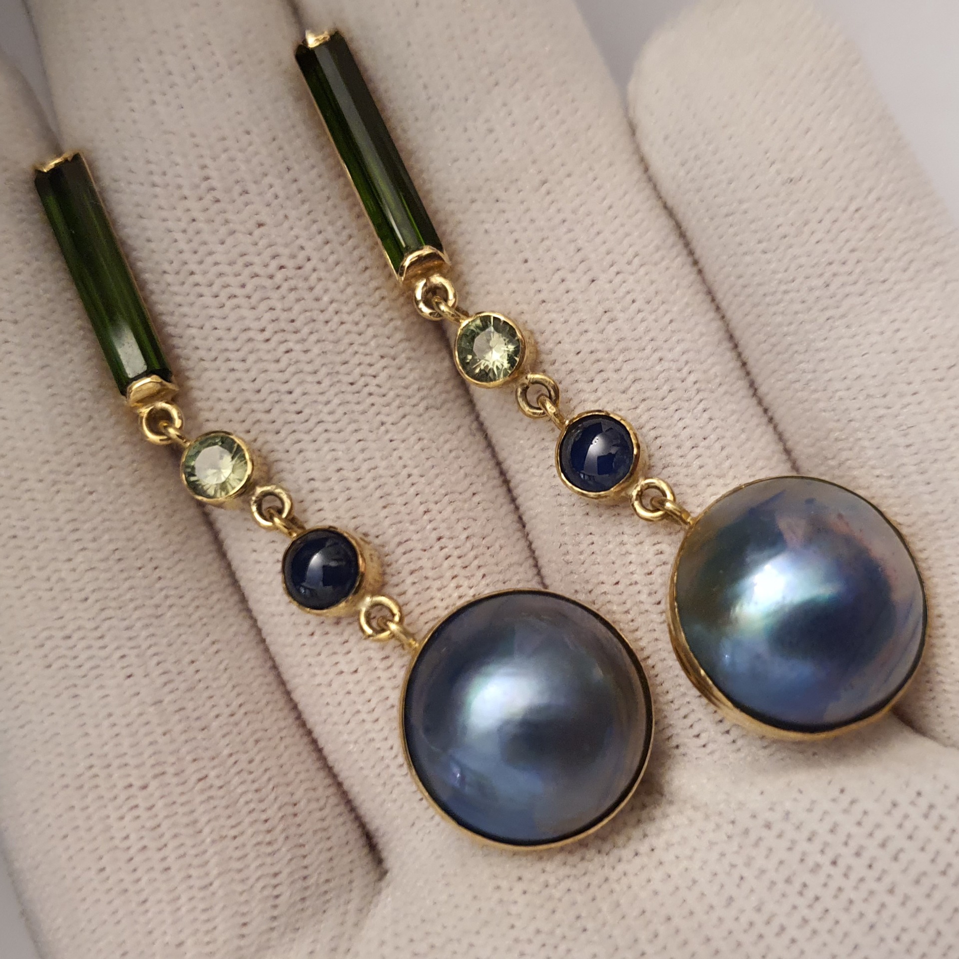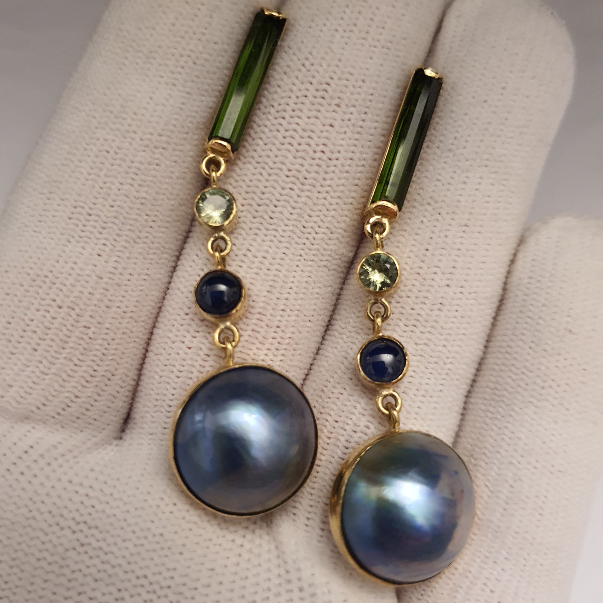 cercei unicat, realizati manual din aur galben 14k, in greutate de 9.34 grame, ornati cu doua turmaline naturale verzi de calitate superioara, mari de 17.5x3.5mm si 3.27 carate, cu doua safire naturale verzi rotunde de 4.5mm si doua safire naturale albastre de 5mm, tratate standard (doar termic), totalizand 1.88 carate, si doua perle naturale mabe, gri cu tonuri de roz, verde si albastru, culori induse in timpul cresterii, mari de 15mm si 16.63 carate; dimensiuni cercei: 60x16mm