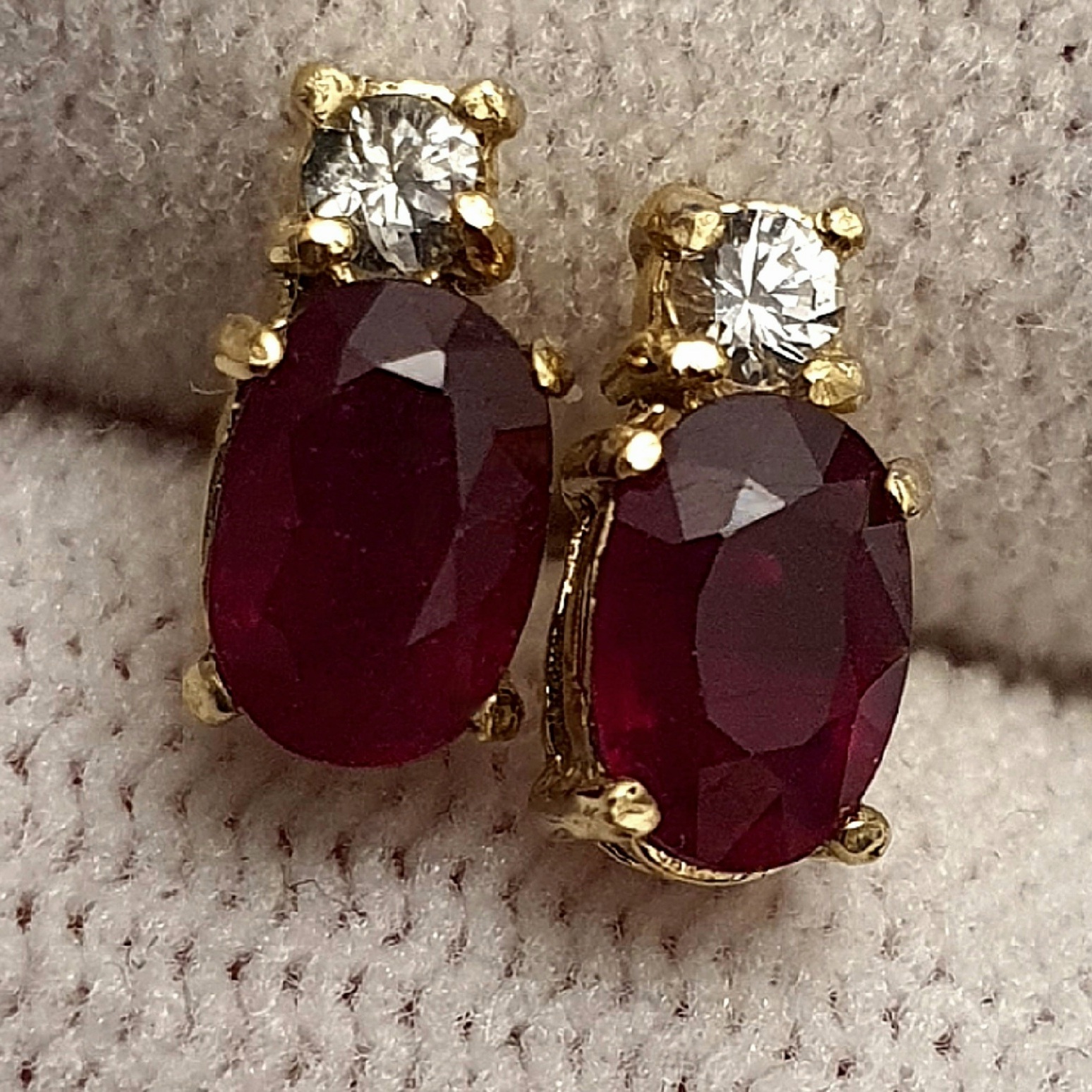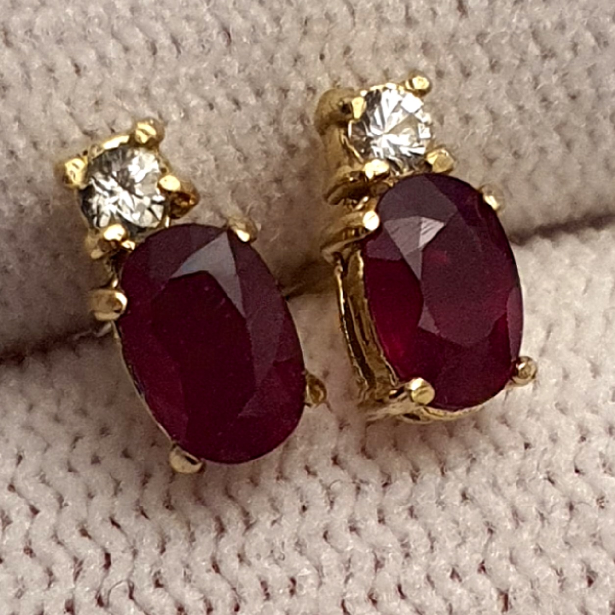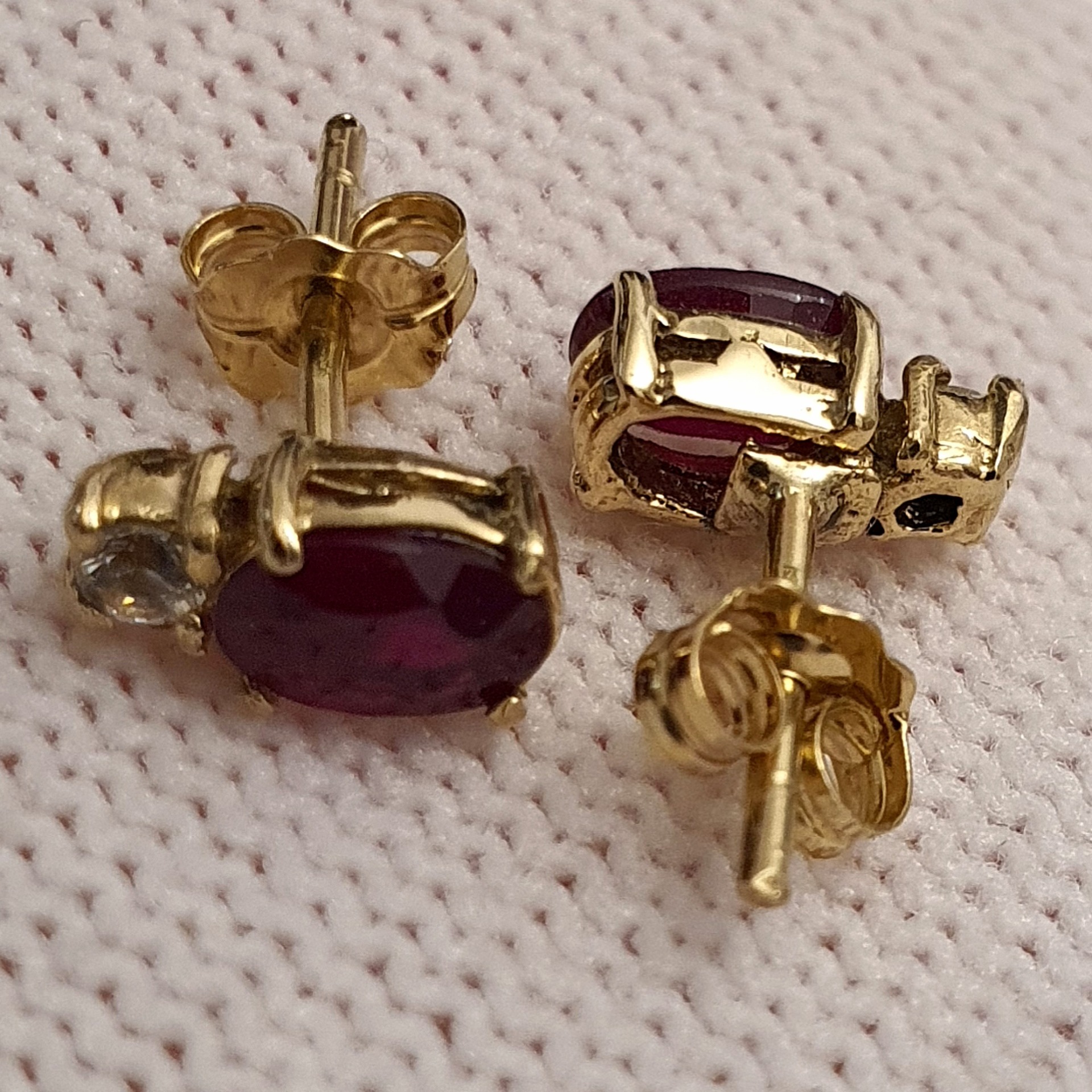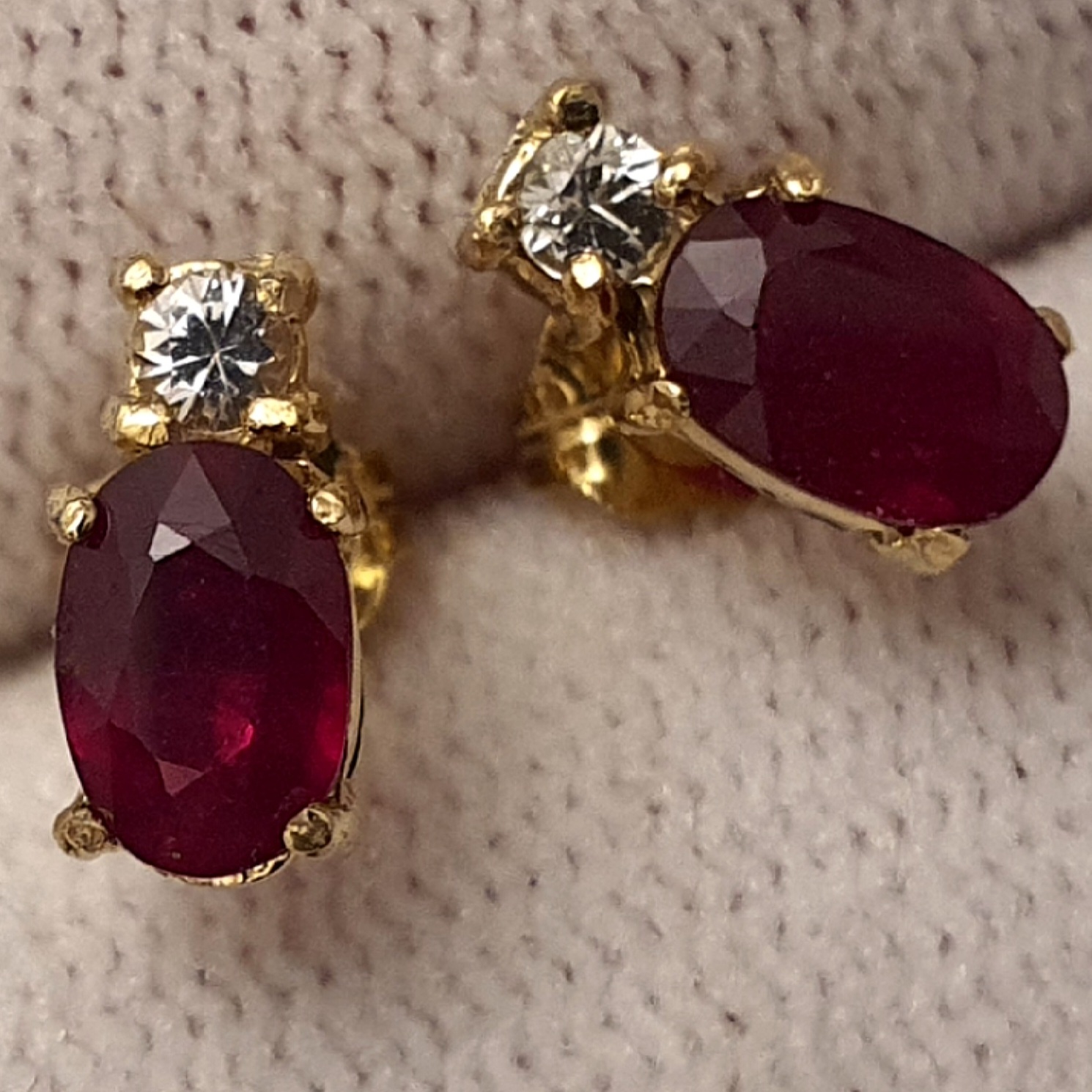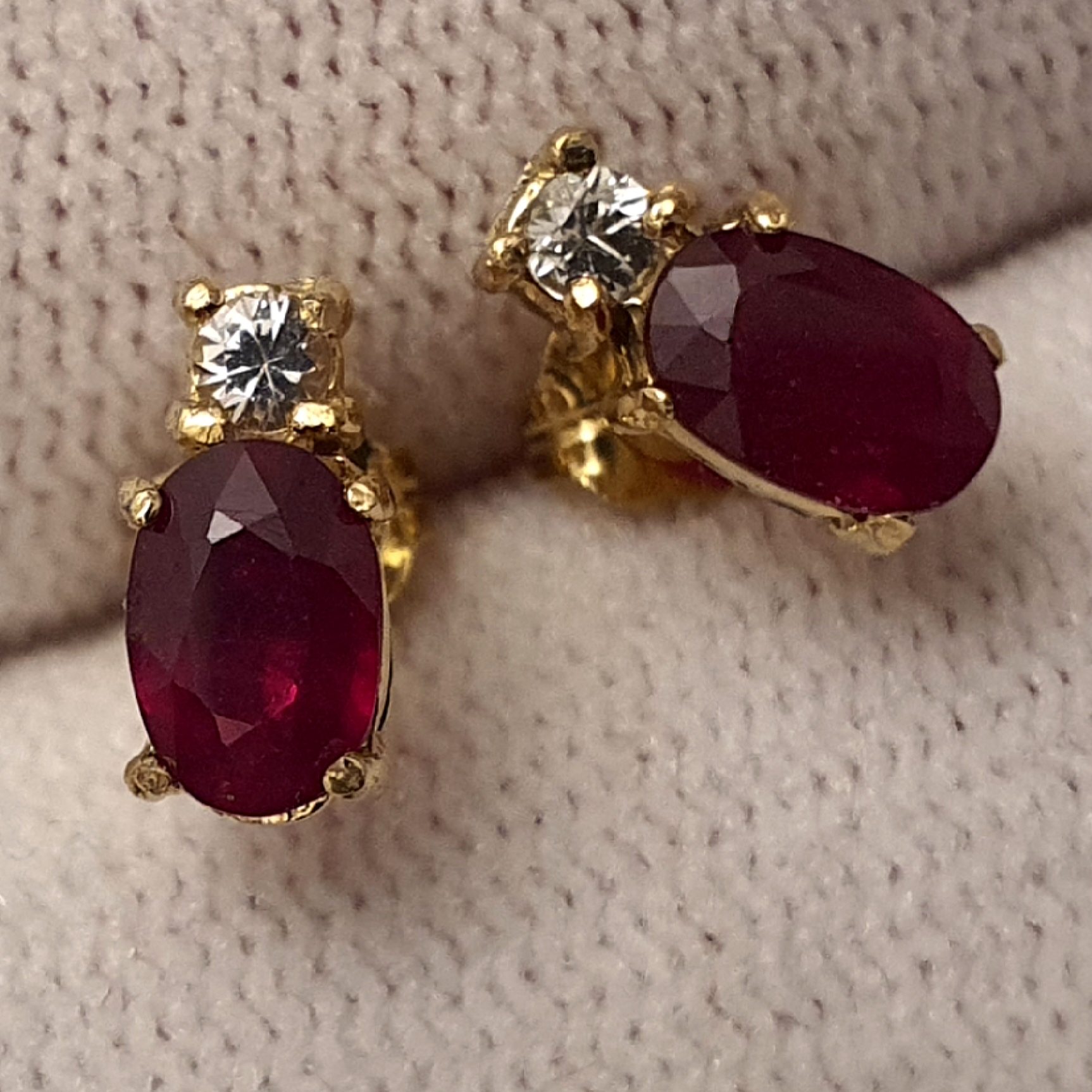 cercei stud din aur galben 14k, in greutate de 1.56 grame, cu dimensiunile 8.5x4.5mm, ornati cu doua safire naturale tratate termic, incolore, de 2.3mm si 0.11ct, si cu doua rubine naturale rosii cu tratment standard, de 1.15ct si 6x4mm