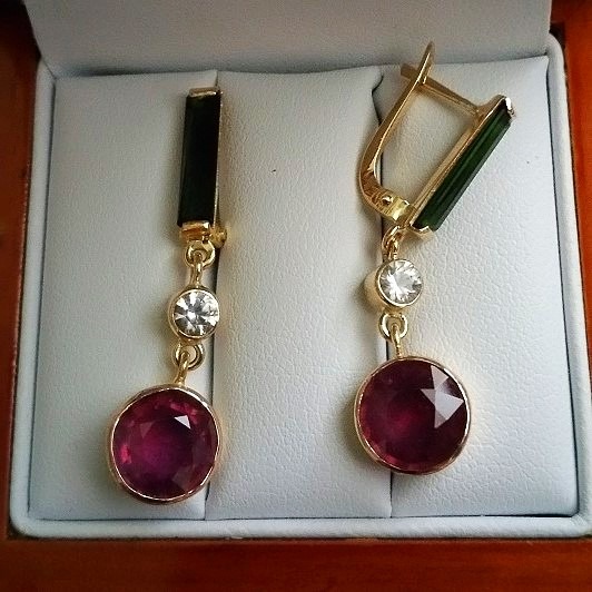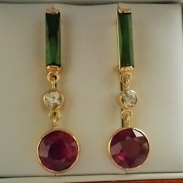 simplitate sofisticata, cercei unicat realizati manual din aur galben de 14k, in greutate de 6.18 grame, ornati cu doua turmaline naturale verzi de calitate superioara, de 13.5x3.5mm si 1.90 carate, doua safire naturale incolore calitate superioara, rotunde de 4mm si 0.536 carate, si doua rubine naturale, rotunde de 9mm si 6.67 carate, tratate standard; dimensiuni cercei 40x10mm