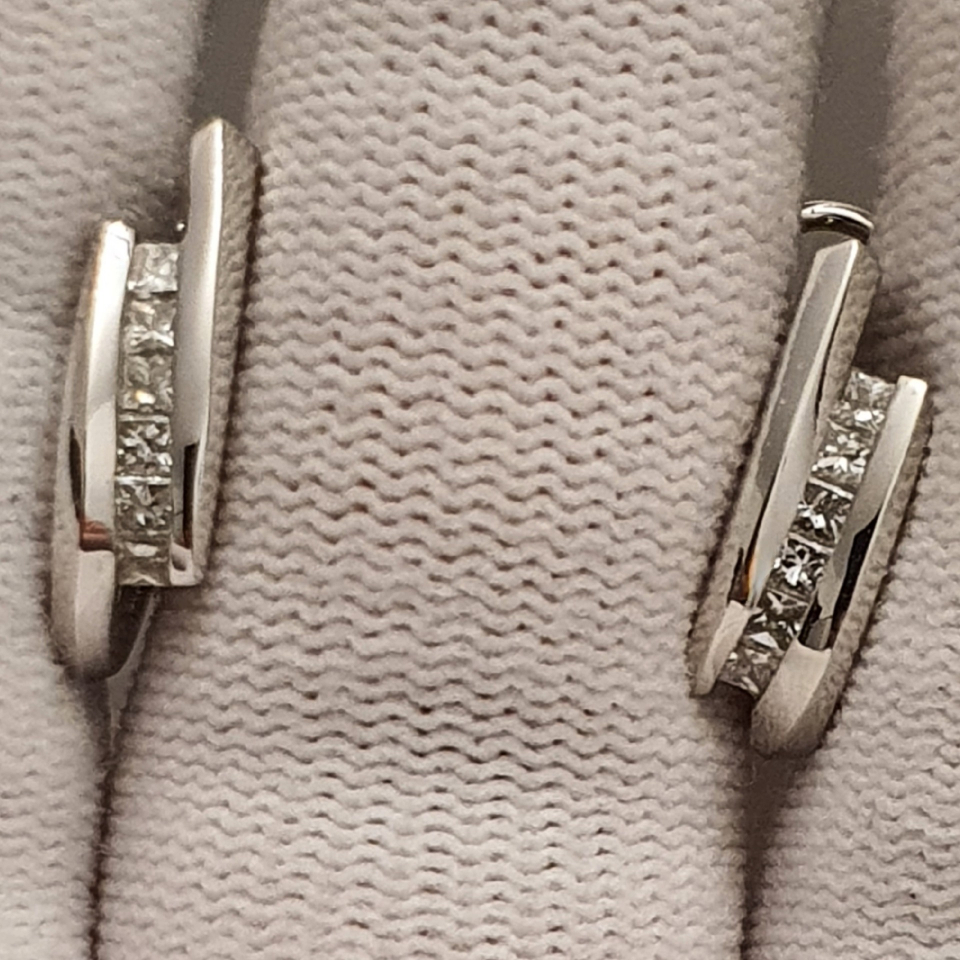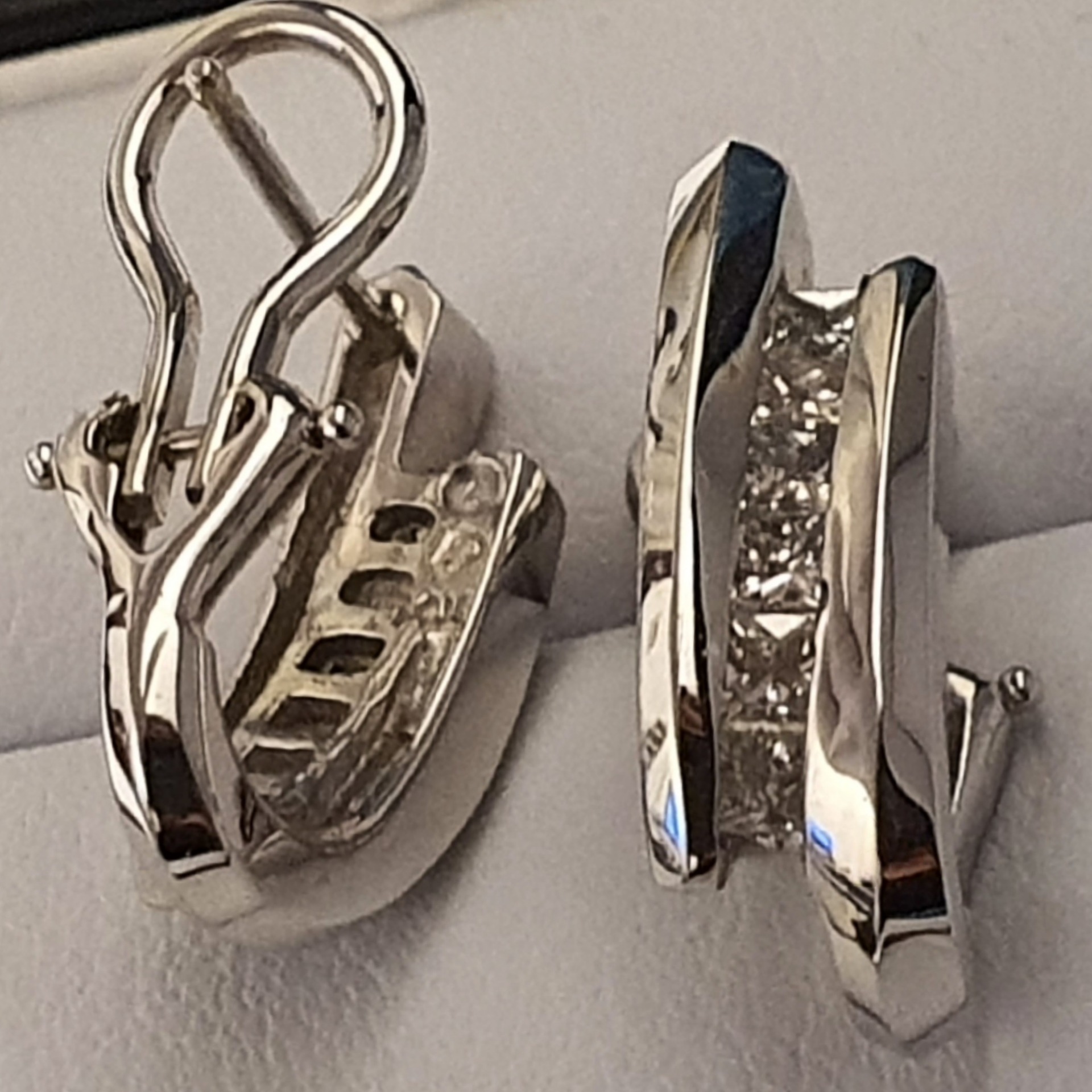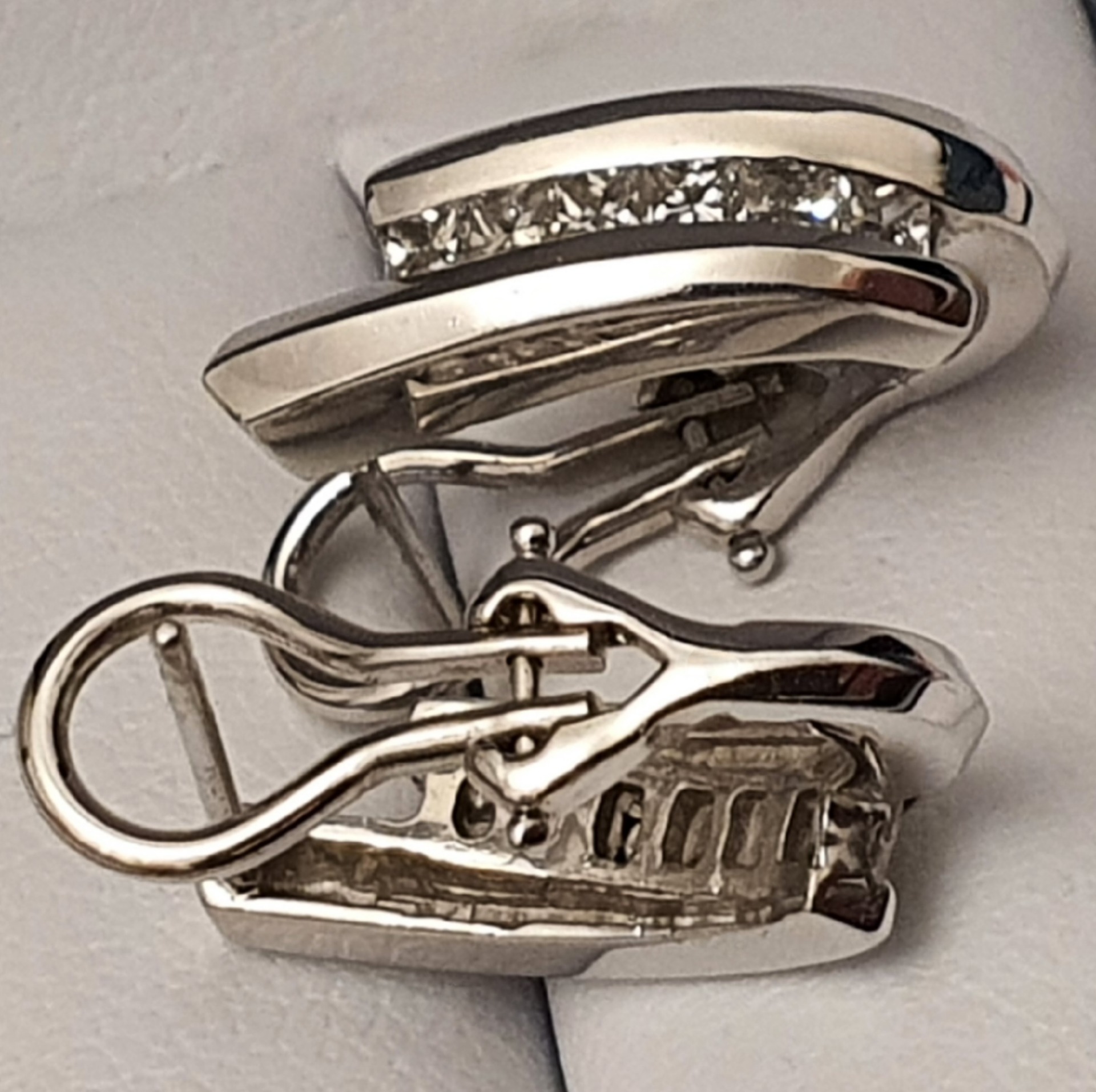 cercei aur alb 14k, perfecti pentru tinute office si casual, in greutate de 5.23 grame, ornati cu 12 diamante naturale fatetate princess I/SI2-3, totalizand 0.75ct; inchidere omega; dimensiuni: 18 x 5.50mm