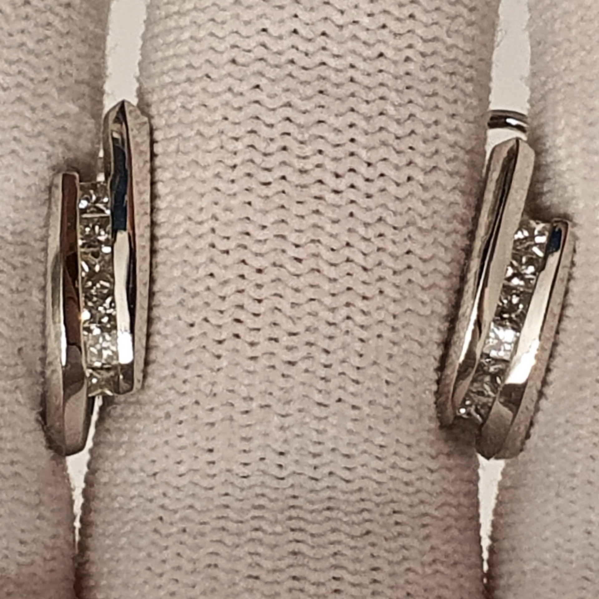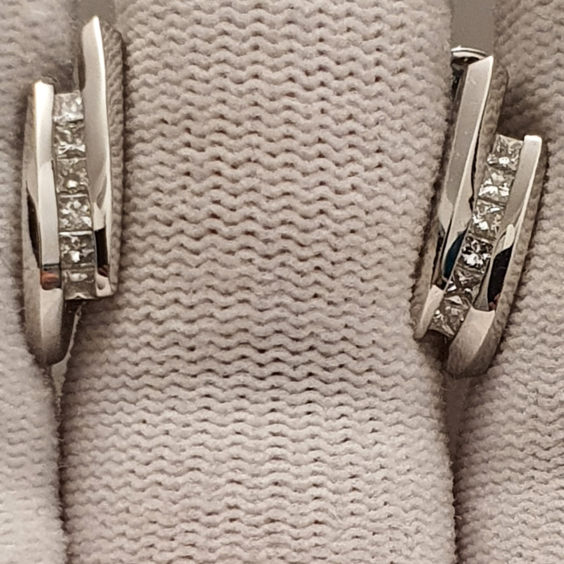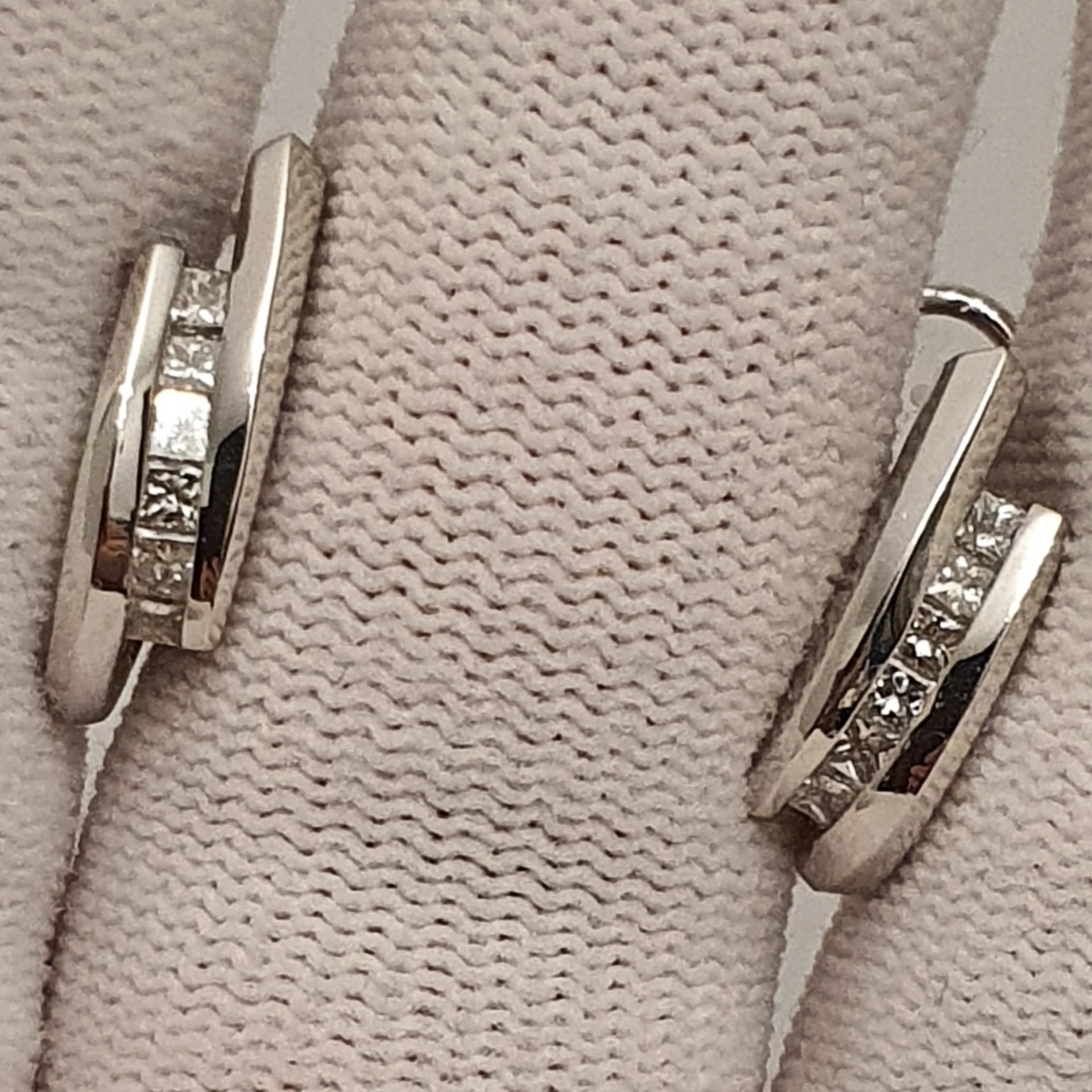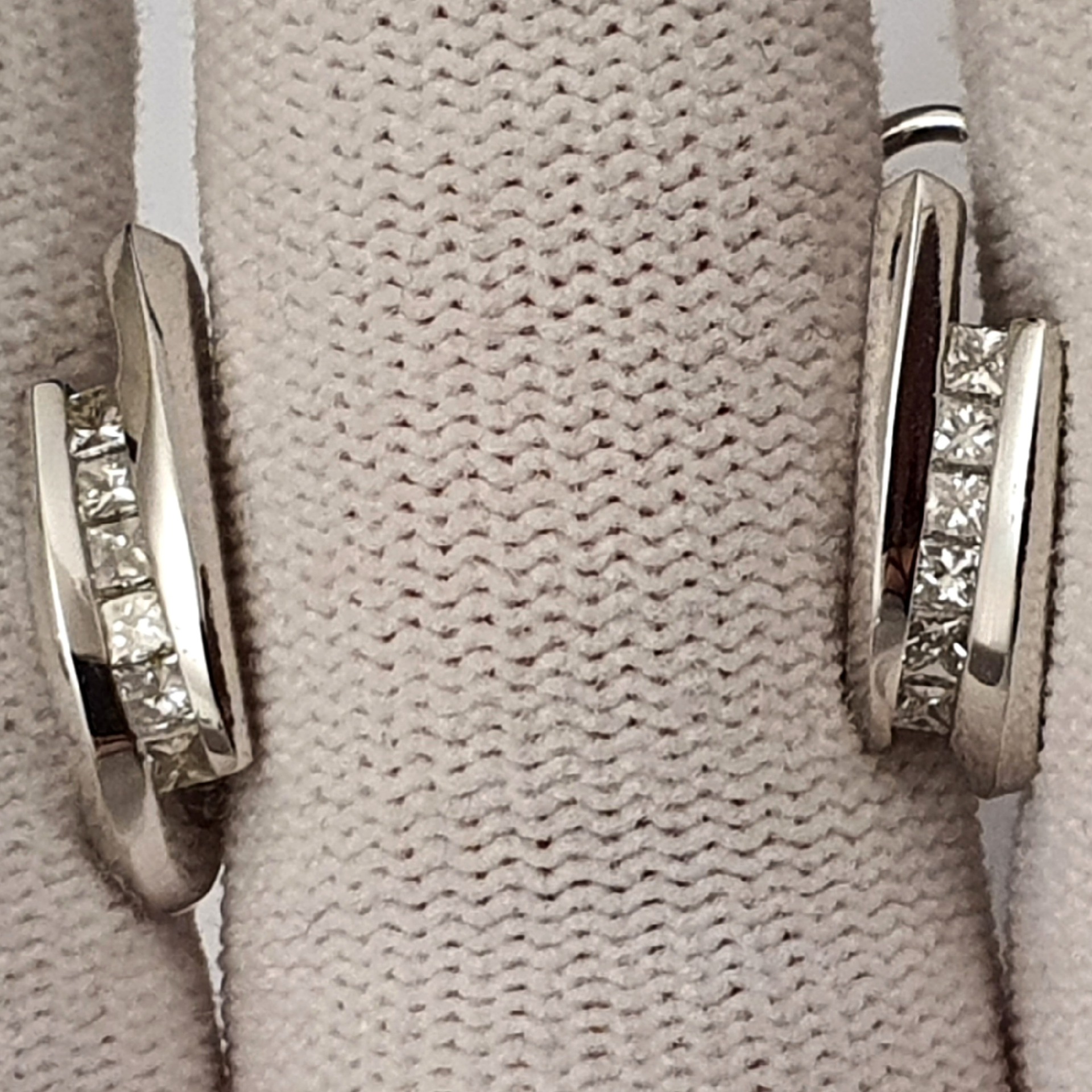 cercei aur alb 14k, perfecti pentru tinute office si casual, in greutate de 5.23 grame, ornati cu 12 diamante naturale fatetate princess I/SI2-3, totalizand 0.75ct; inchidere omega; dimensiuni: 18 x 5.50mm