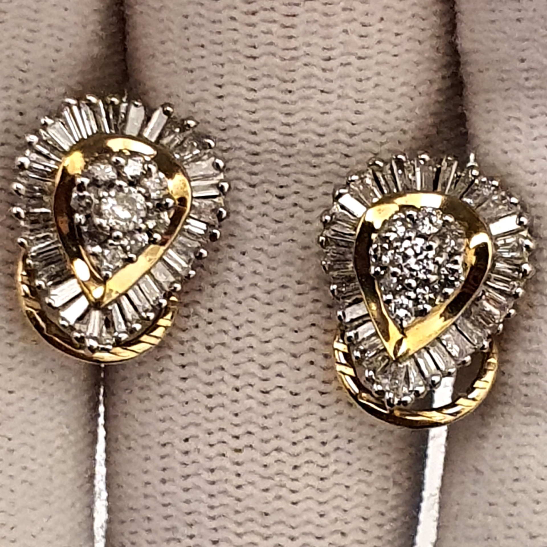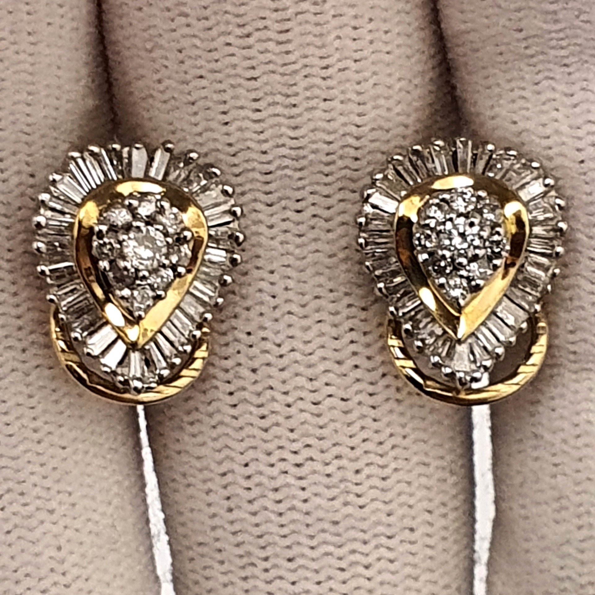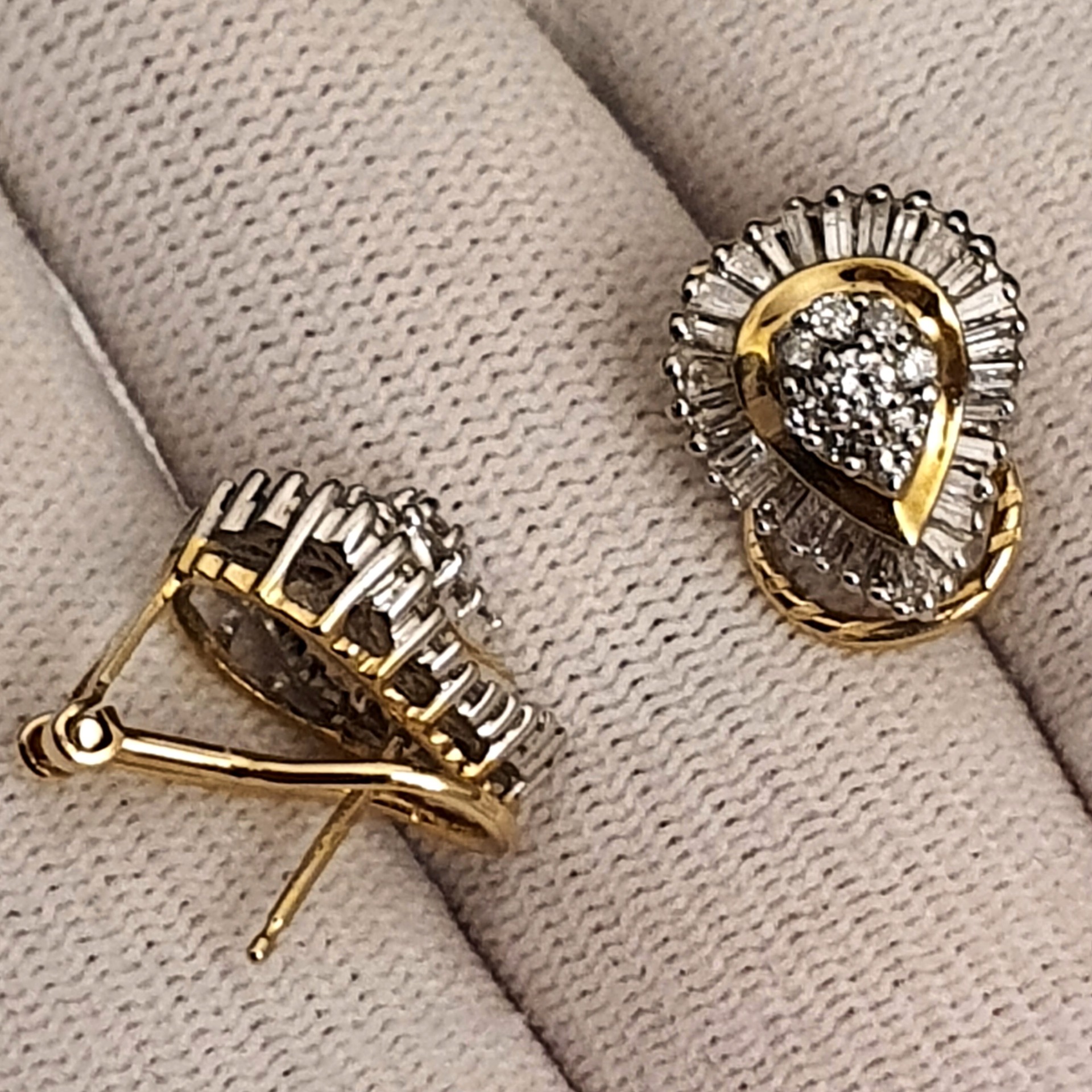 frumosi cercei model balerina (anturaj ondulat), cu inchidere omega, realizati din aur galben de 14k si aur alb de 10k, in greutate de 6.35 grame, ornati cu 1.45ct diamante naturale H-I/SI3 (56 baghete de 1.15ct si 18 rotunde de 0.30ct); montura masoara aprox. 15 x 13mm