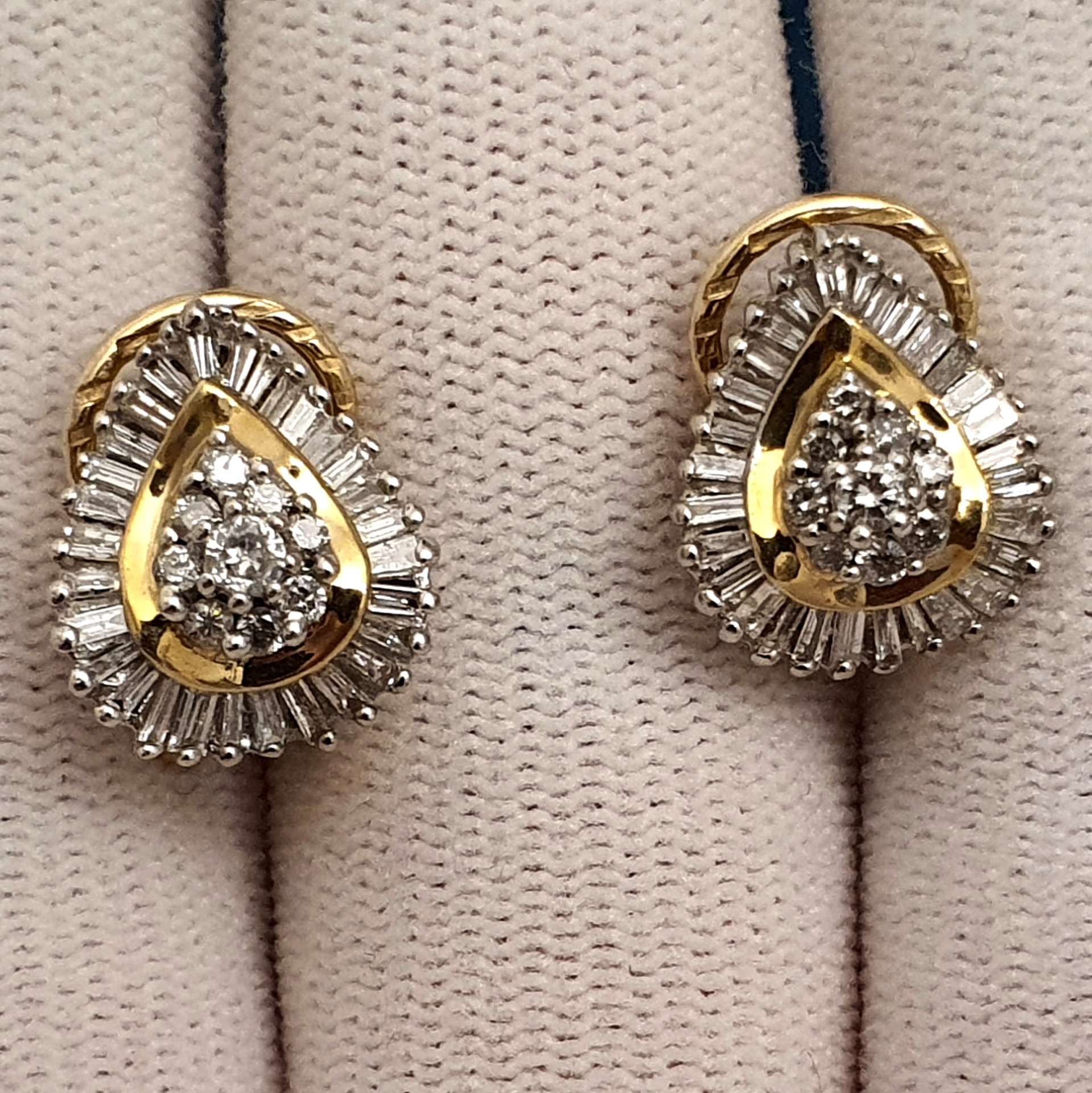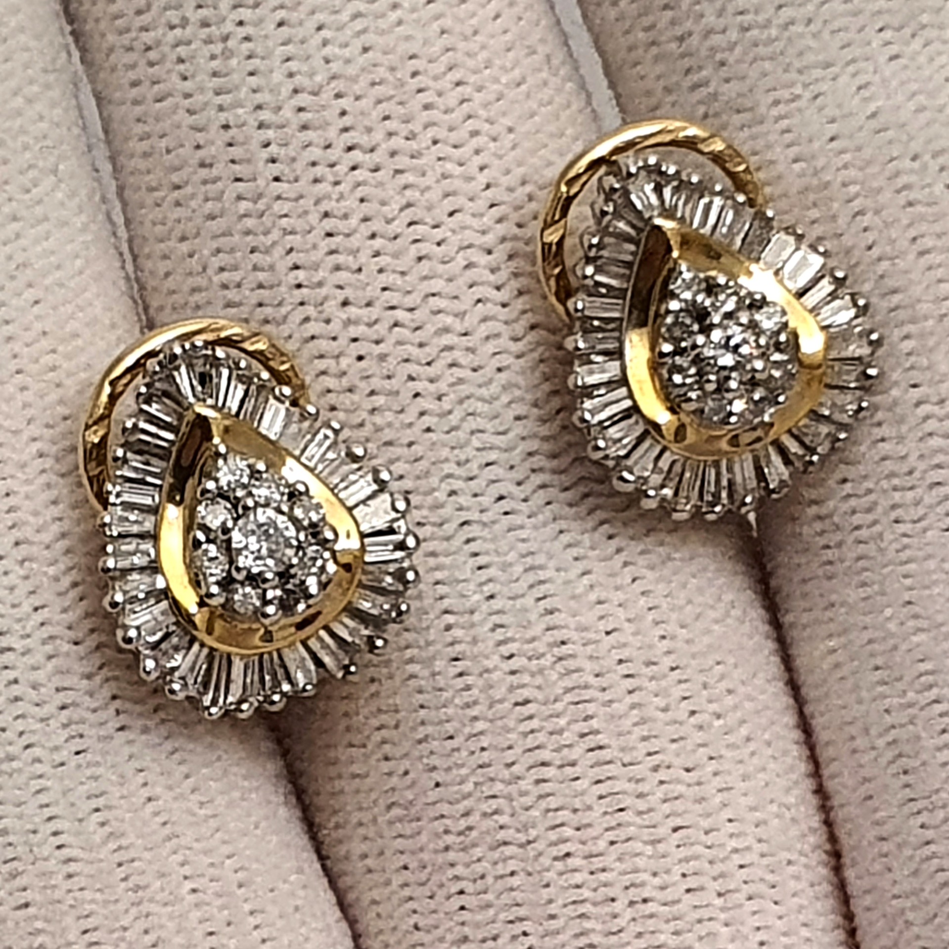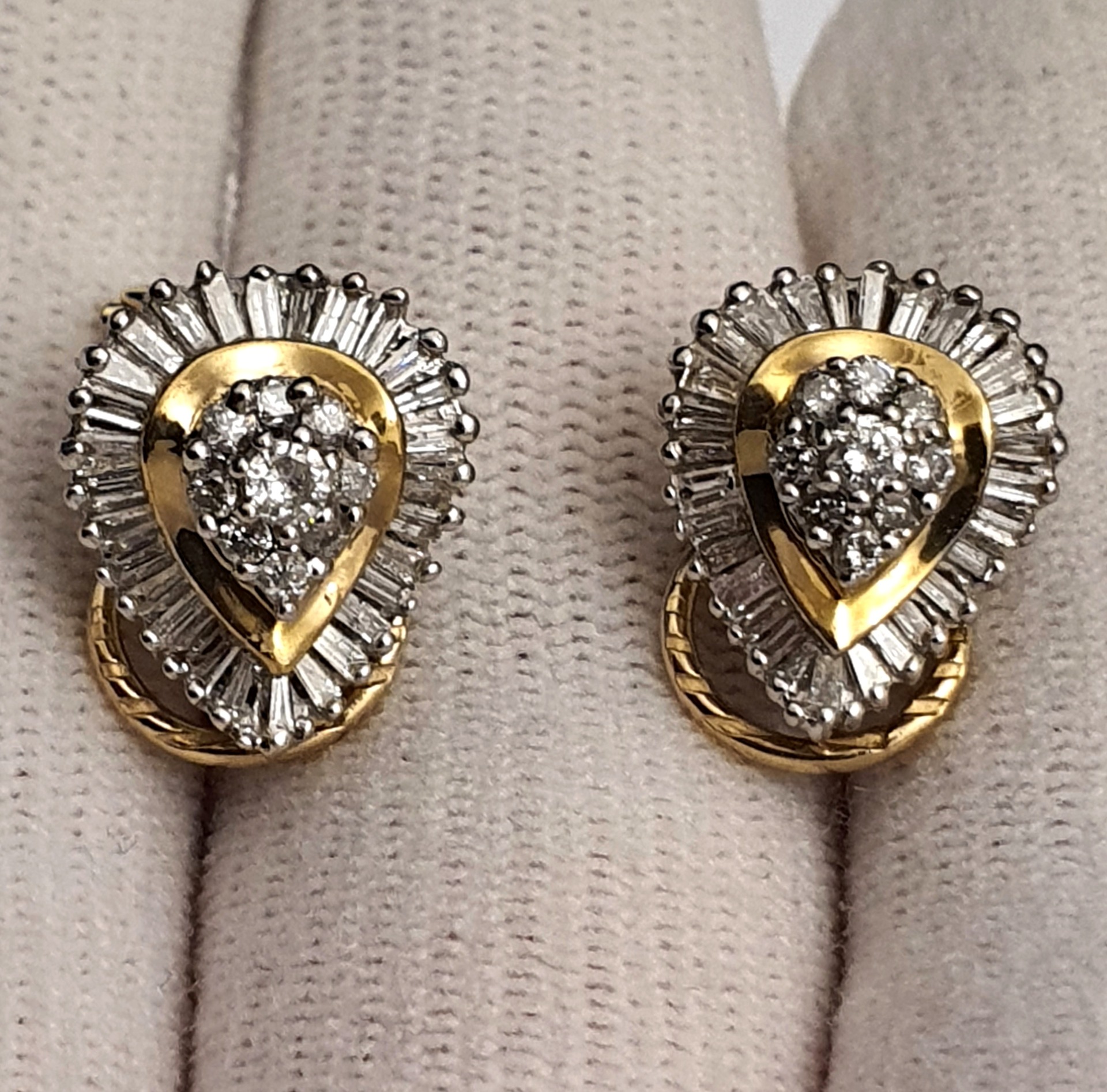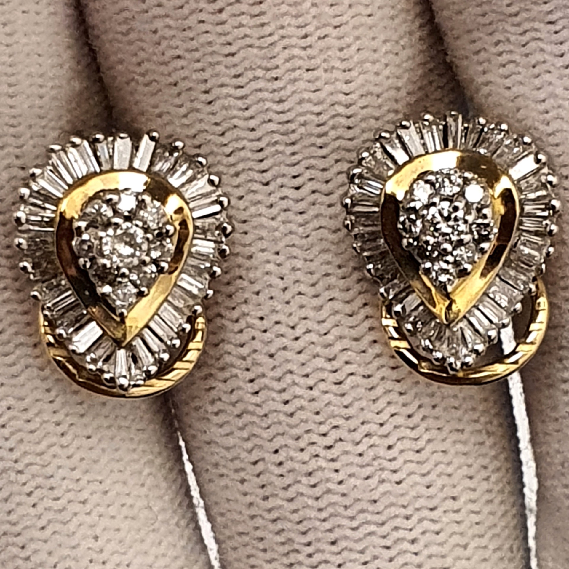 frumosi cercei model balerina (anturaj ondulat), cu inchidere omega, realizati din aur galben de 14k si aur alb de 10k, in greutate de 6.35 grame, ornati cu 1.45ct diamante naturale H-I/SI3 (56 baghete de 1.15ct si 18 rotunde de 0.30ct); montura masoara aprox. 15 x 13mm