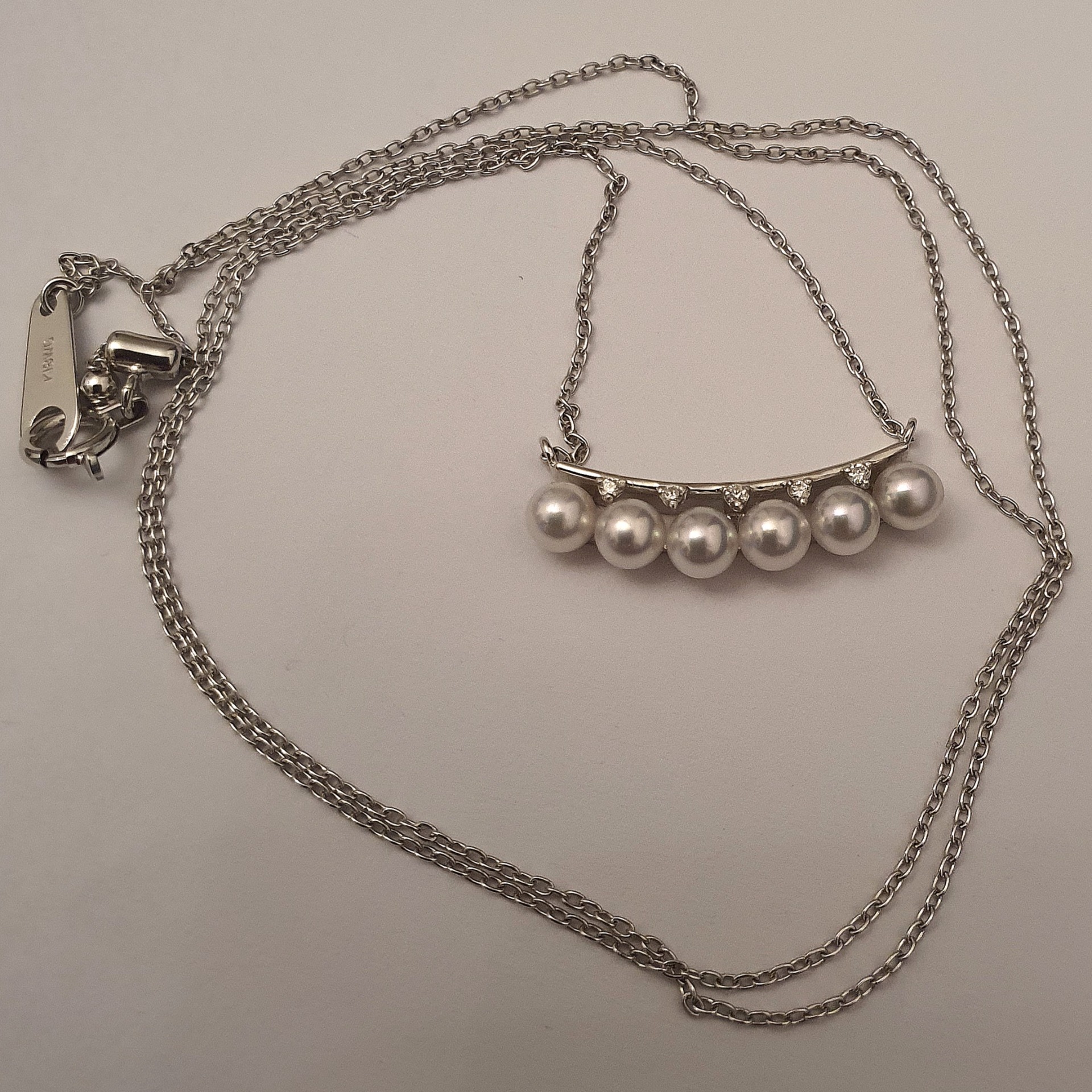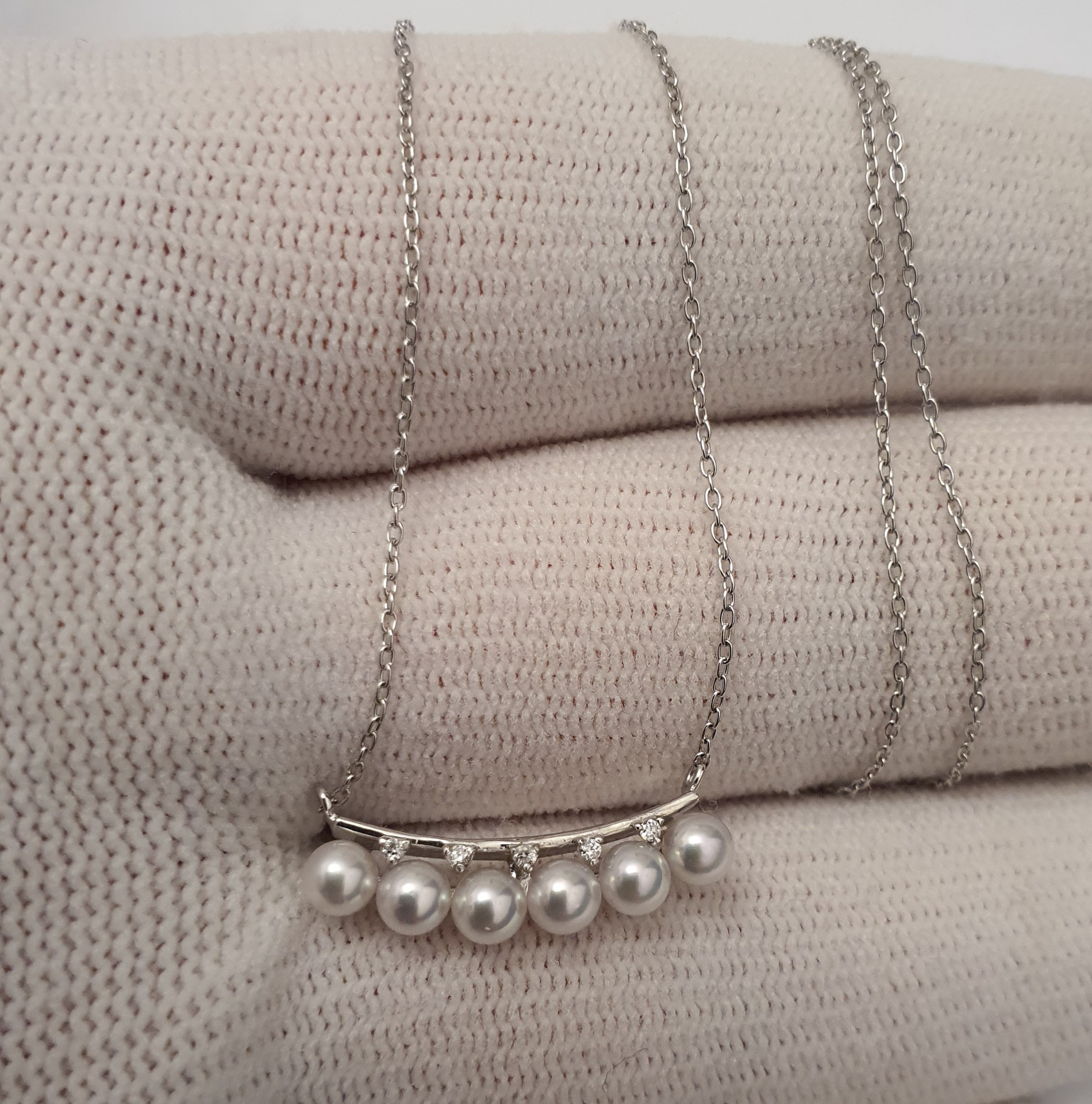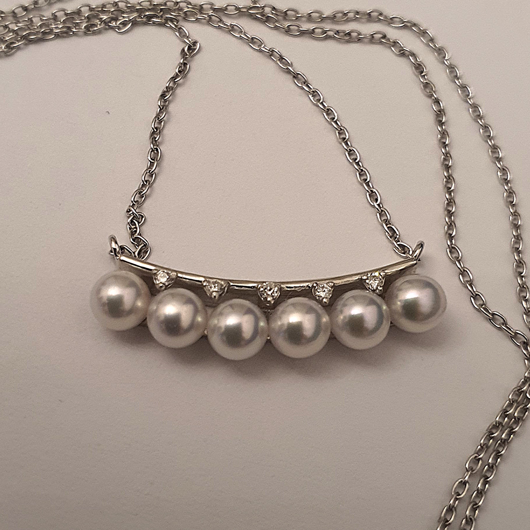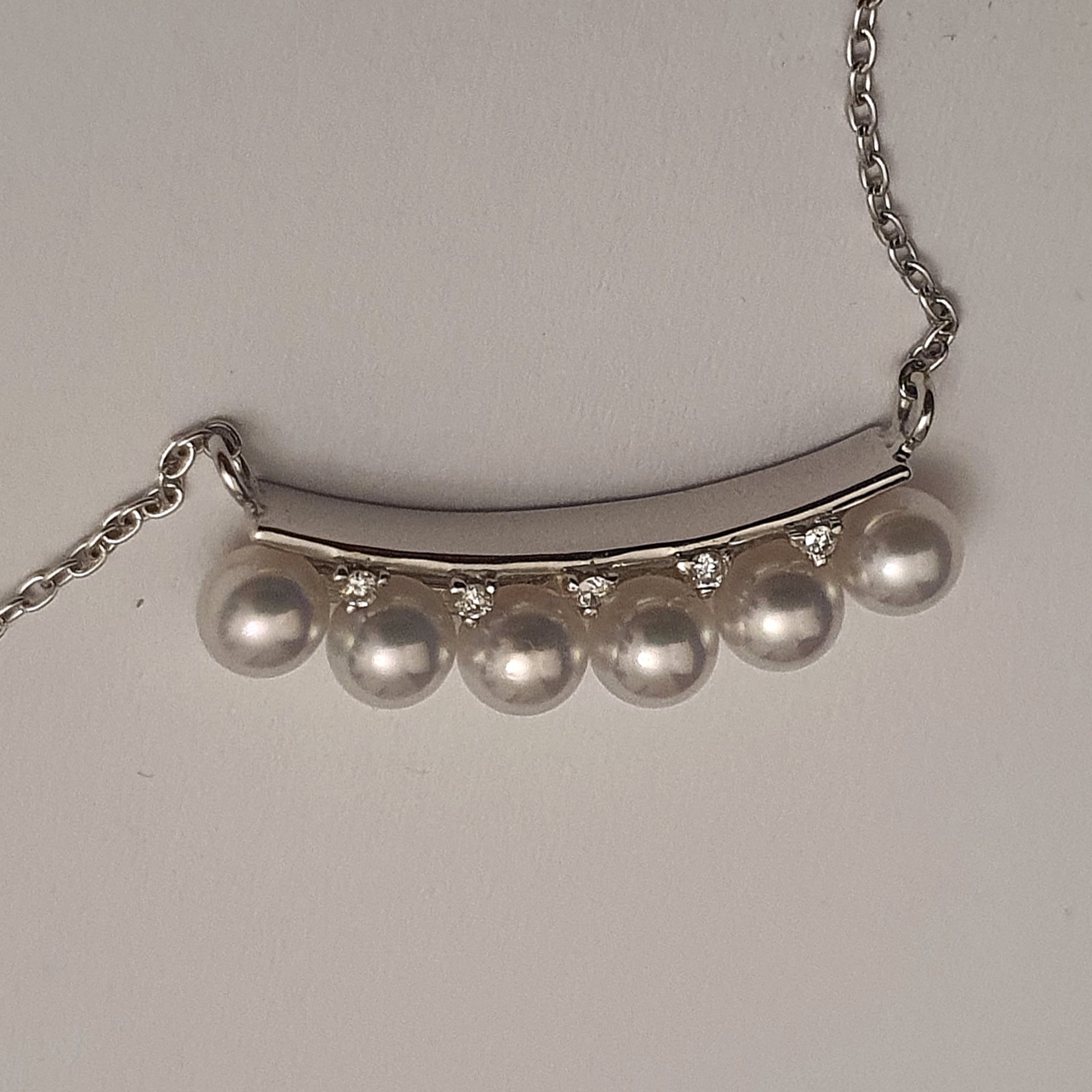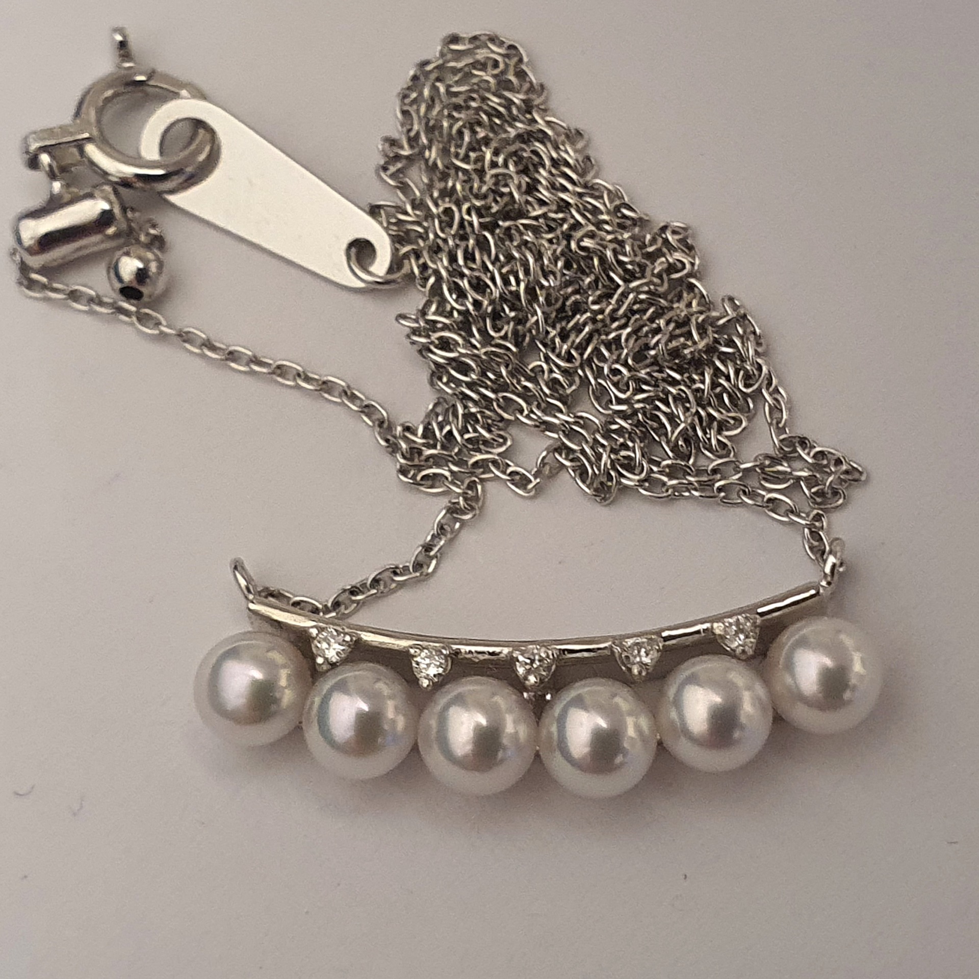 frumusete delicata si eleganta: colier aur alb 18k in greutate de 2.68 grame, ornat cu 6 perle naturale akoya de calitate superioara, cu luciu tip oglinda, albe cu foarte usoare tonuri de roz si bleu, si cu 5 diamante accent de 1.1-1.05x0.66mm si 0.02ct total, calitate F-G/I1-I2; colierul are lungimea de 47cm, cu posibilitatea scurtarii.