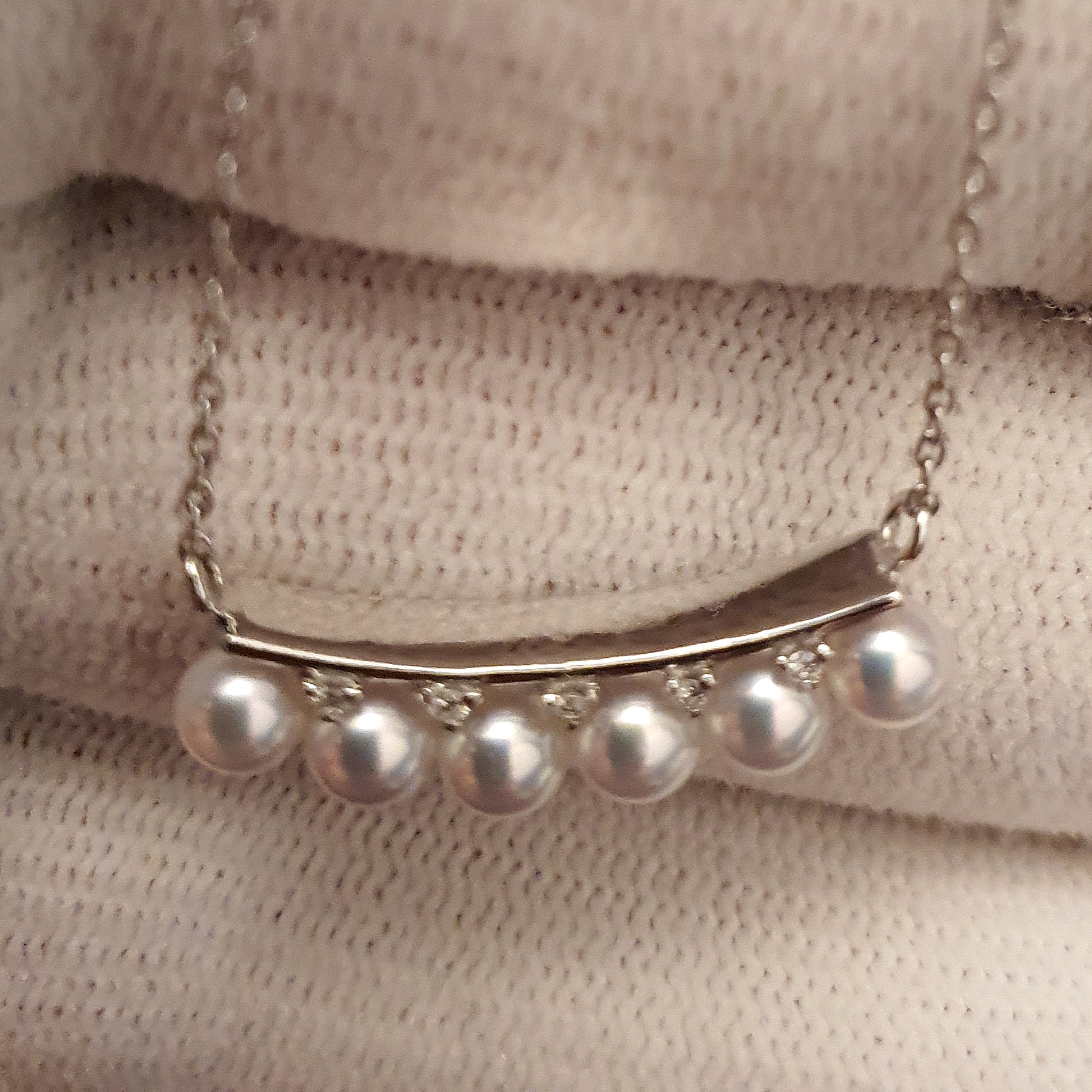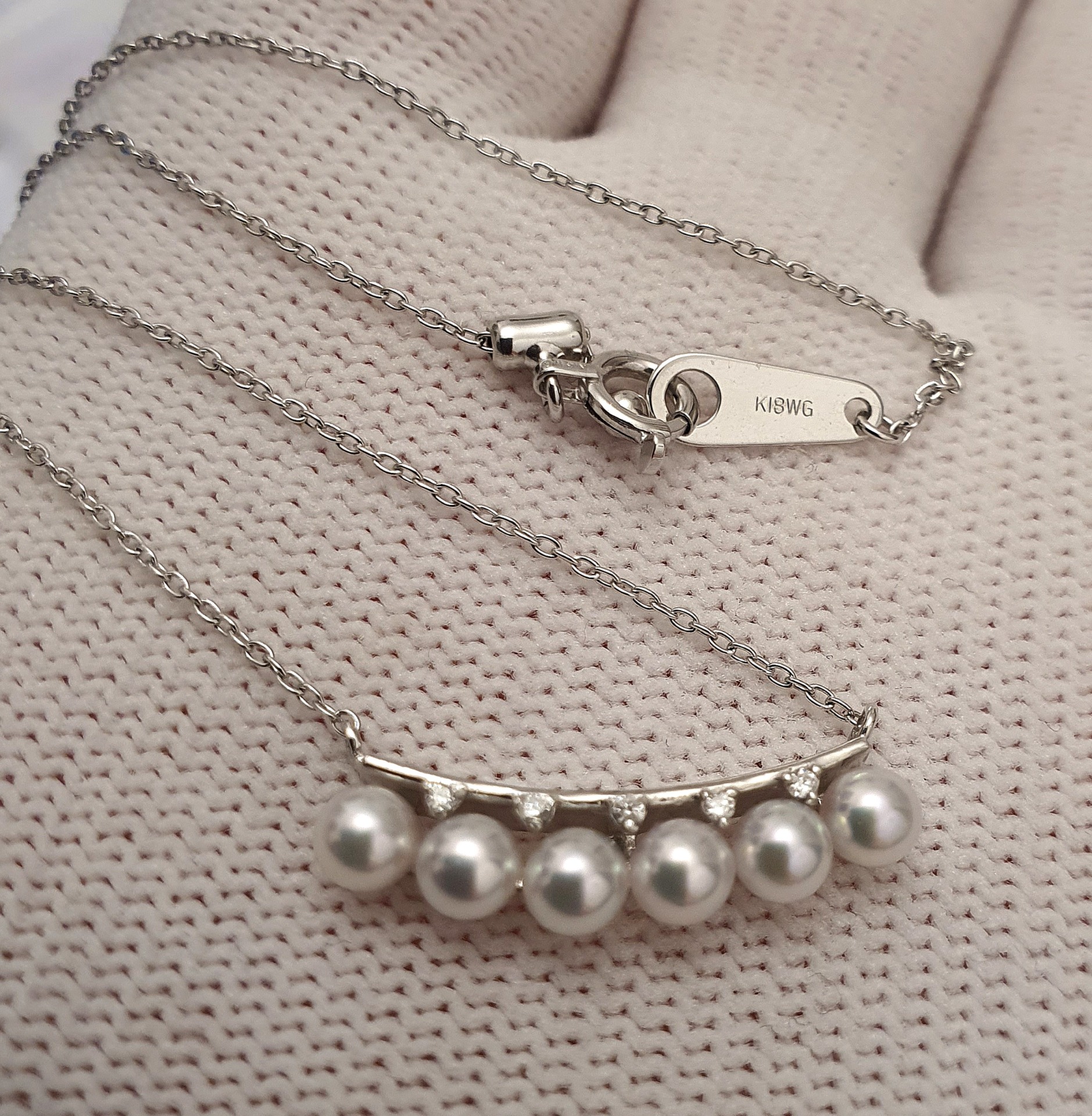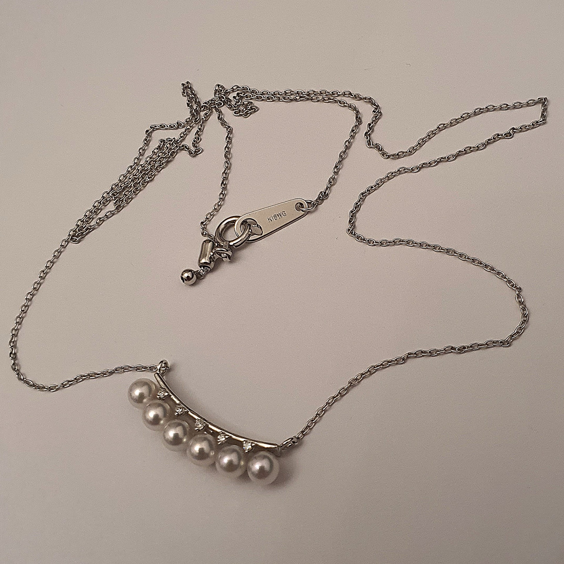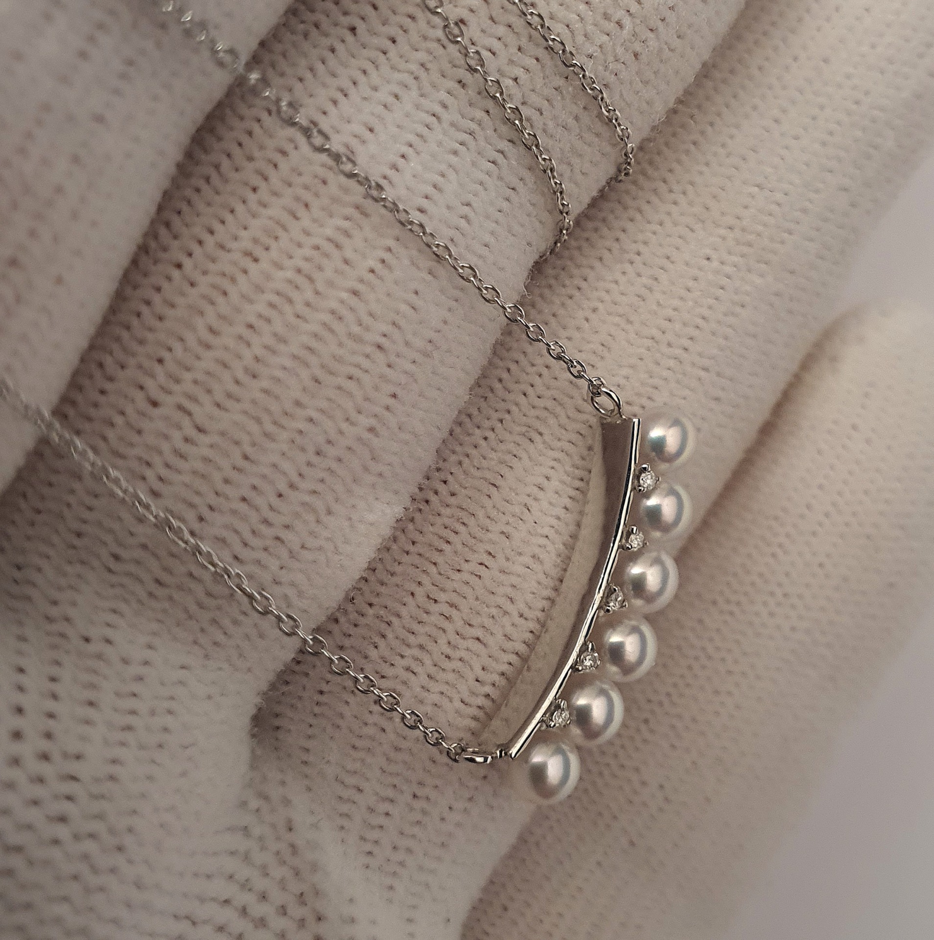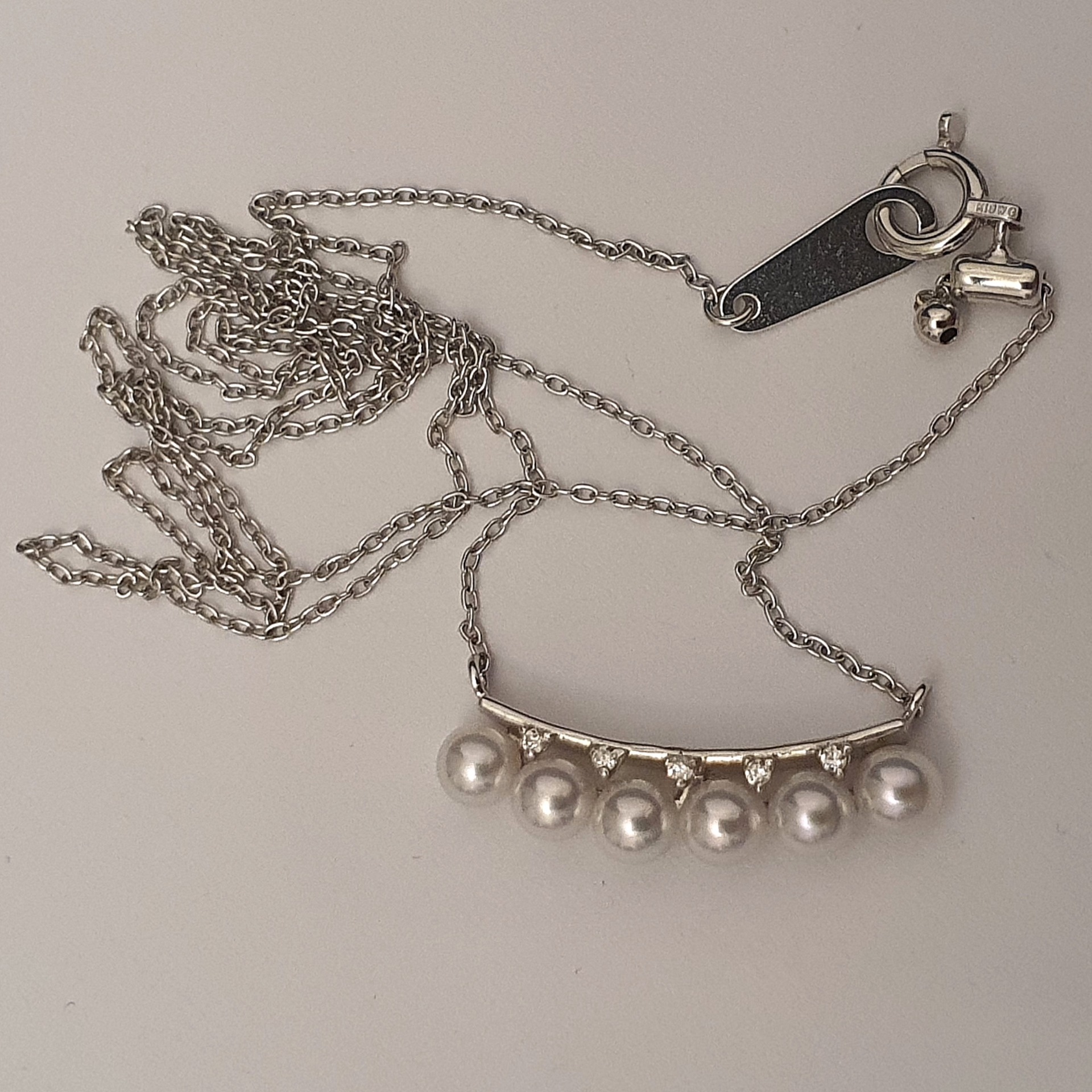 frumusete delicata si eleganta: colier aur alb 18k in greutate de 2.68 grame, ornat cu 6 perle naturale akoya de calitate superioara, cu luciu tip oglinda, albe cu foarte usoare tonuri de roz si bleu, si cu 5 diamante accent de 1.1-1.05x0.66mm si 0.02ct total, calitate F-G/I1-I2; colierul are lungimea de 47cm, cu posibilitatea scurtarii.