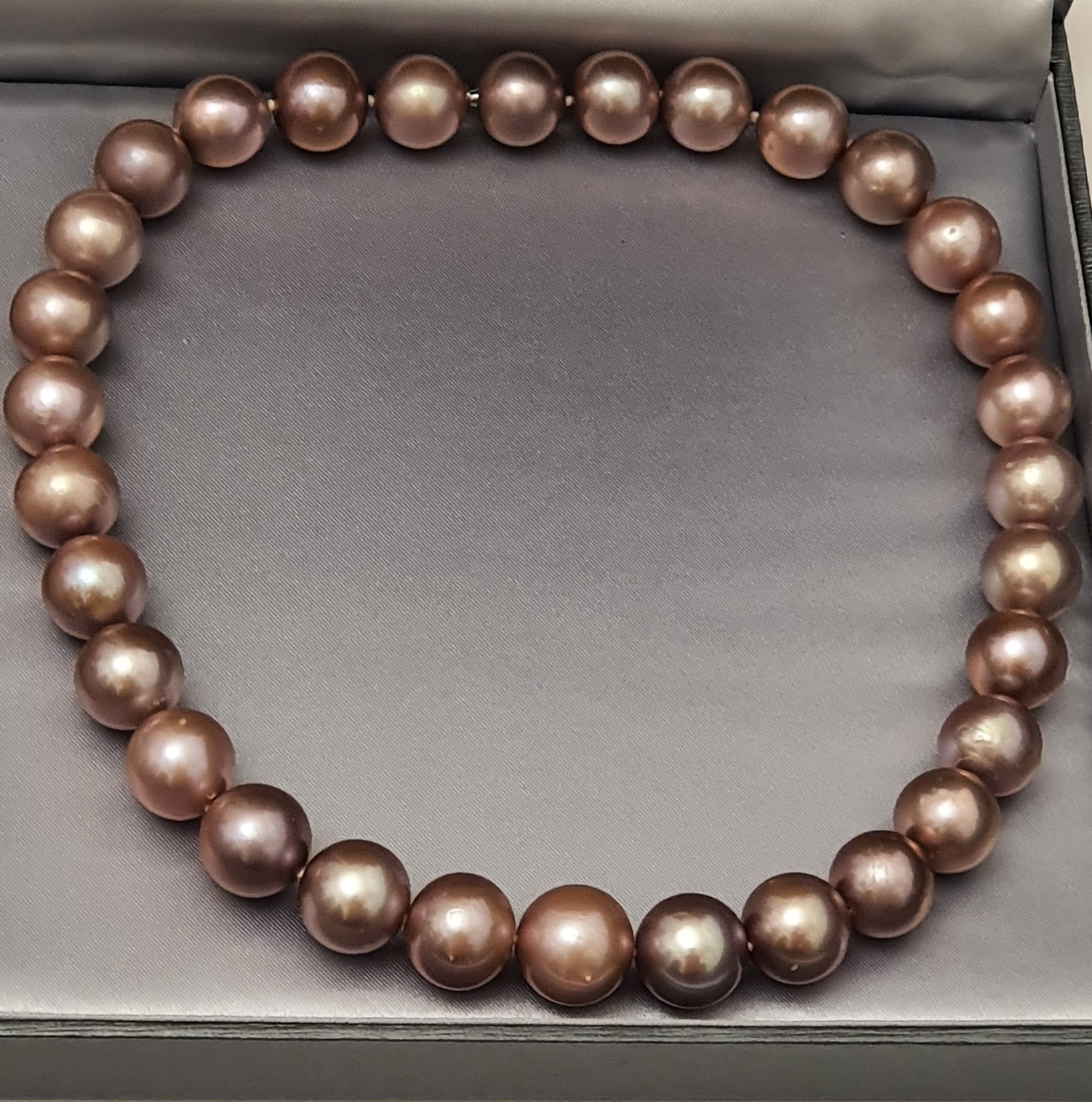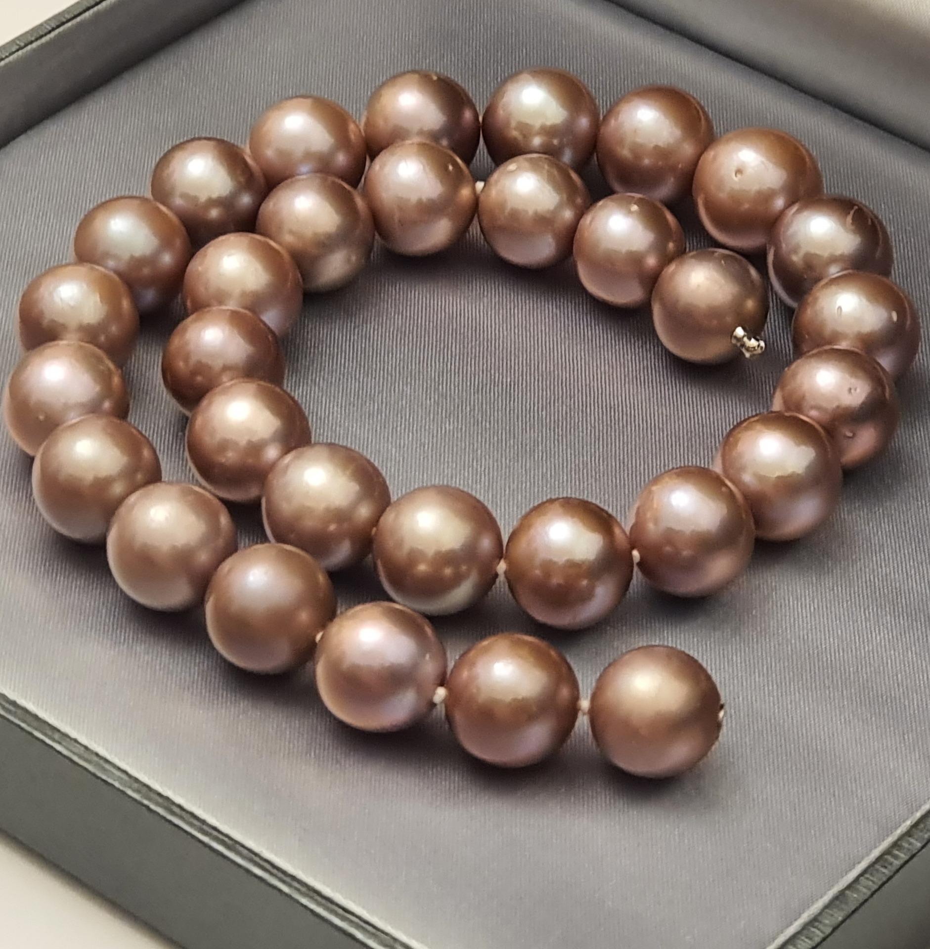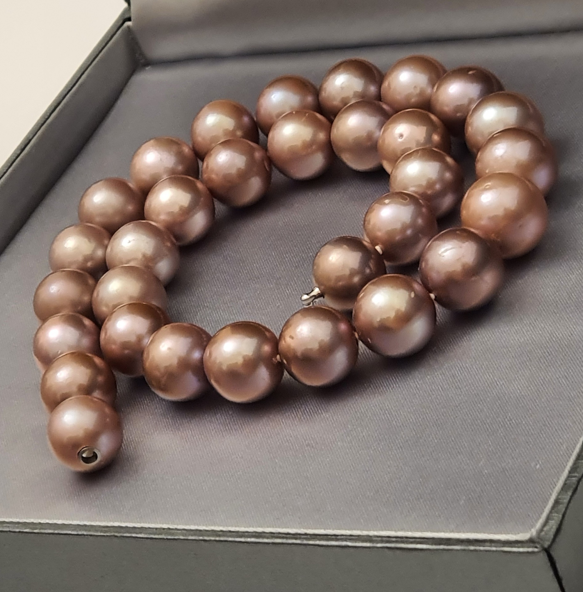 colier perle naturale Edison, frumoase, cu luciu bun si foarte bun, cu cateva mici imperfectiuni naturale, perle rotunde, cu dimensiuni de la 12 la 15mm, cu inchizatoare ascunsa din aur alb de 14k; lungimea colierului deschis este de 43cm (vine la baza gatului) si echivaleaza cu o lungime a colierului inchis de aprox. 41.5cm