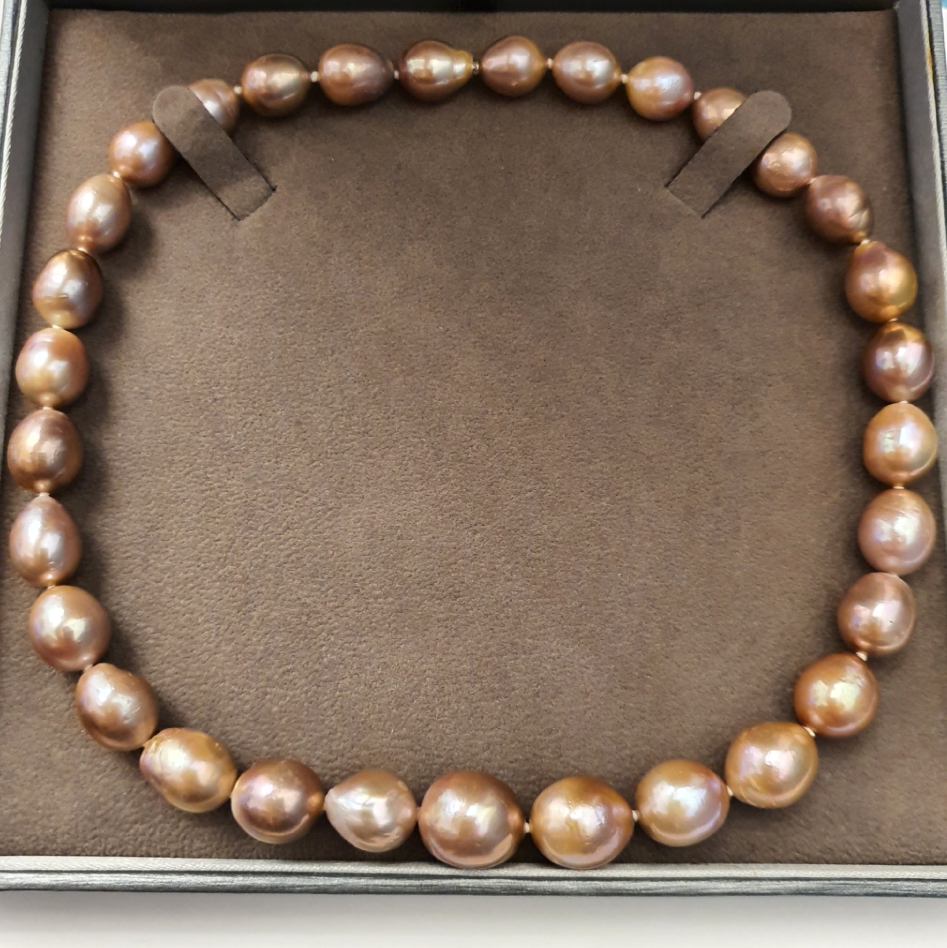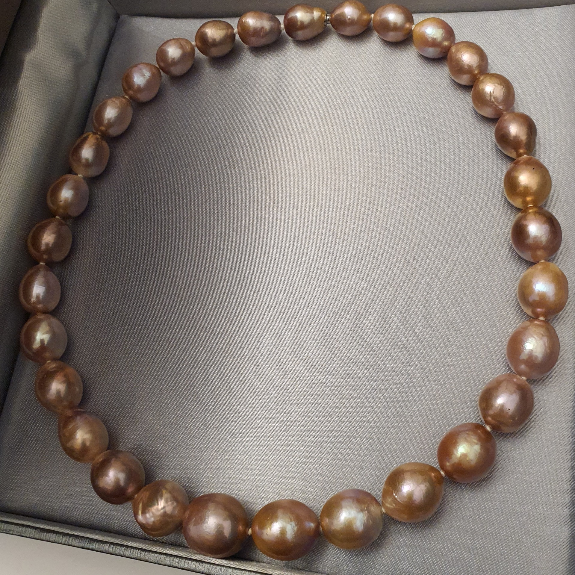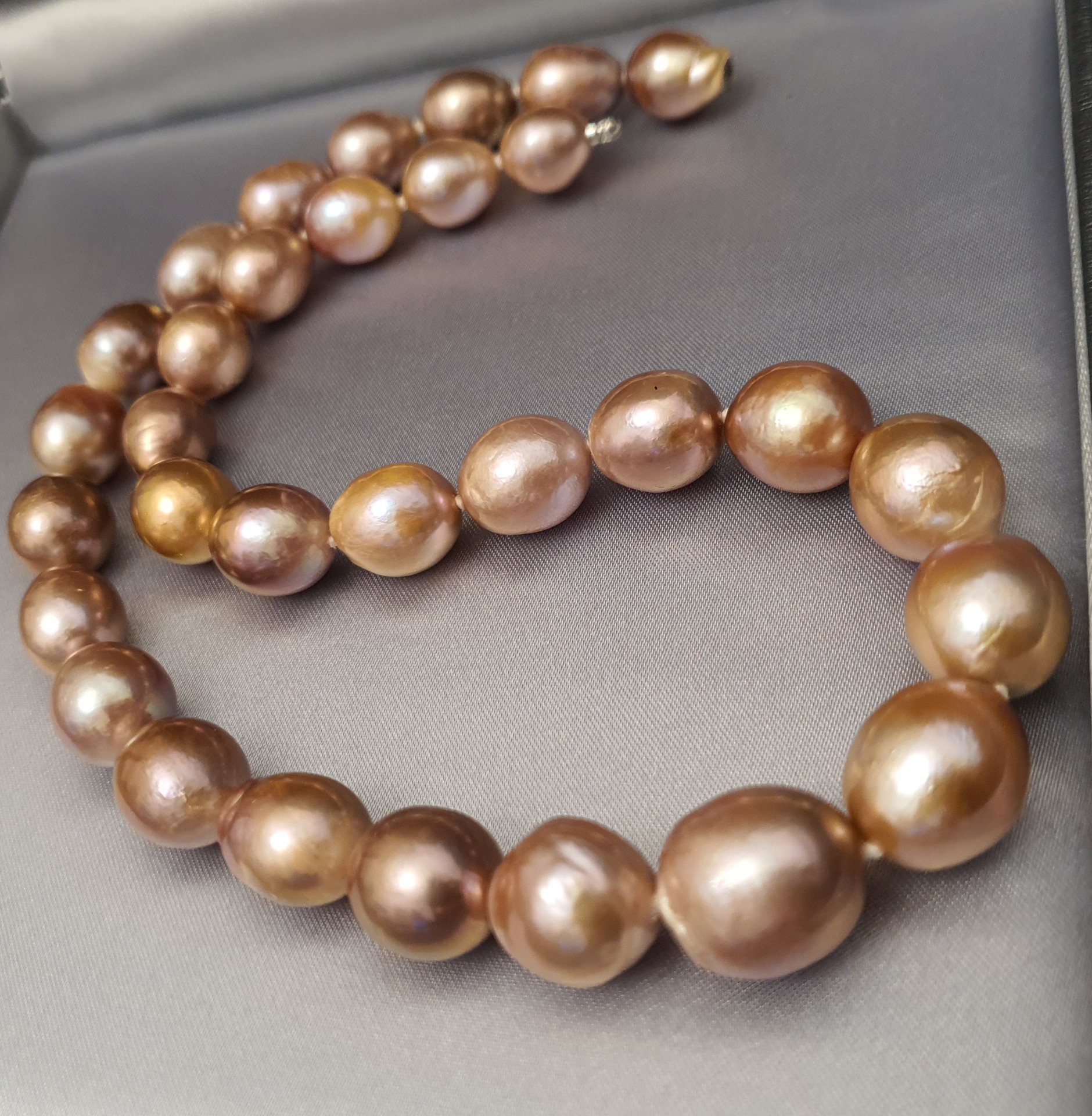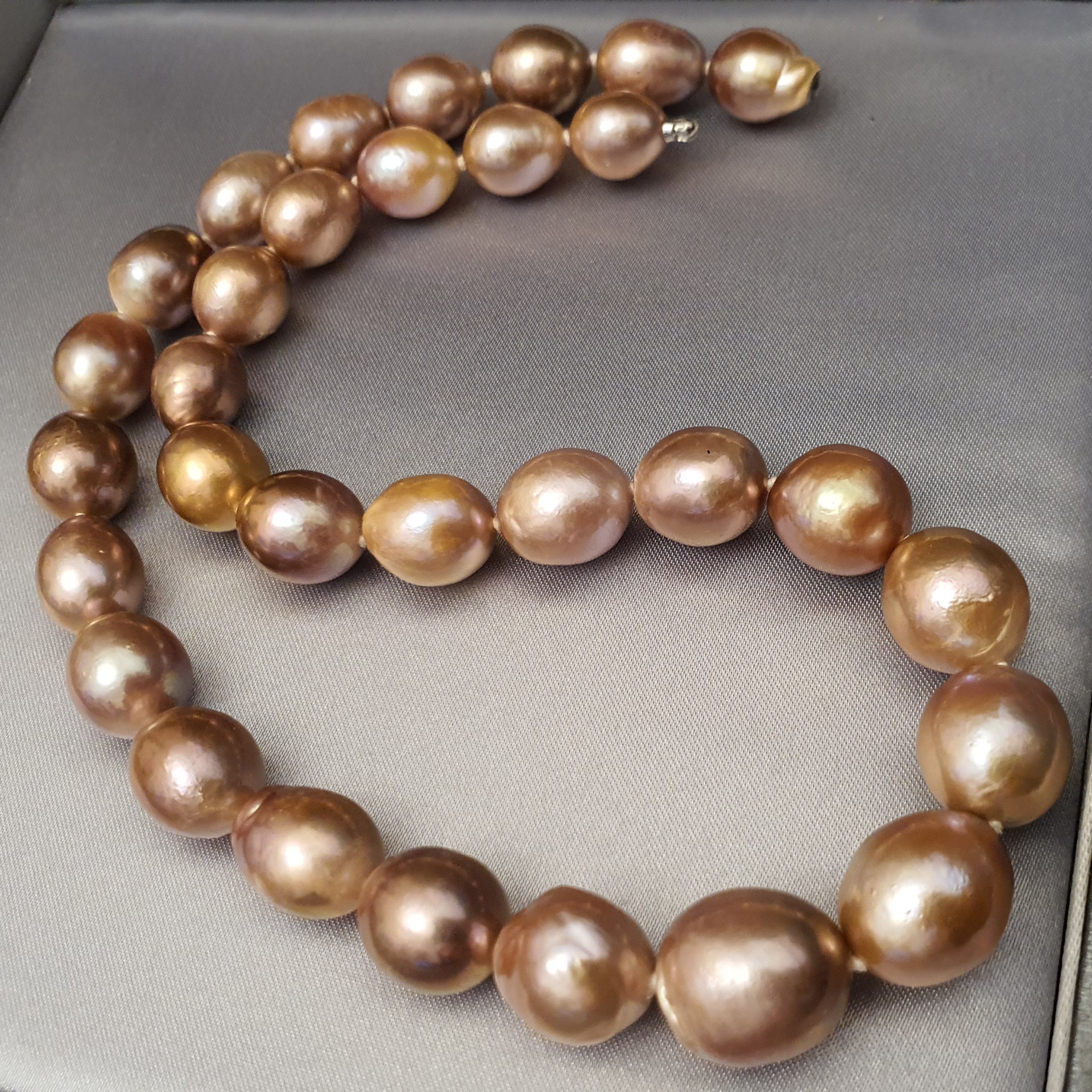 frumos colier perle naturale Edison, cu luciu foarte bun, cu cateva imperfectiuni naturale, perle ovale-baroc cu dimensiuni de la 15.2 x 14mm la 11.5 x 10.3mm, cu inchizatoare ascunsa din aur alb de 14k; colierul are greutatea de 70.68 grame si lungimea de 43 cm