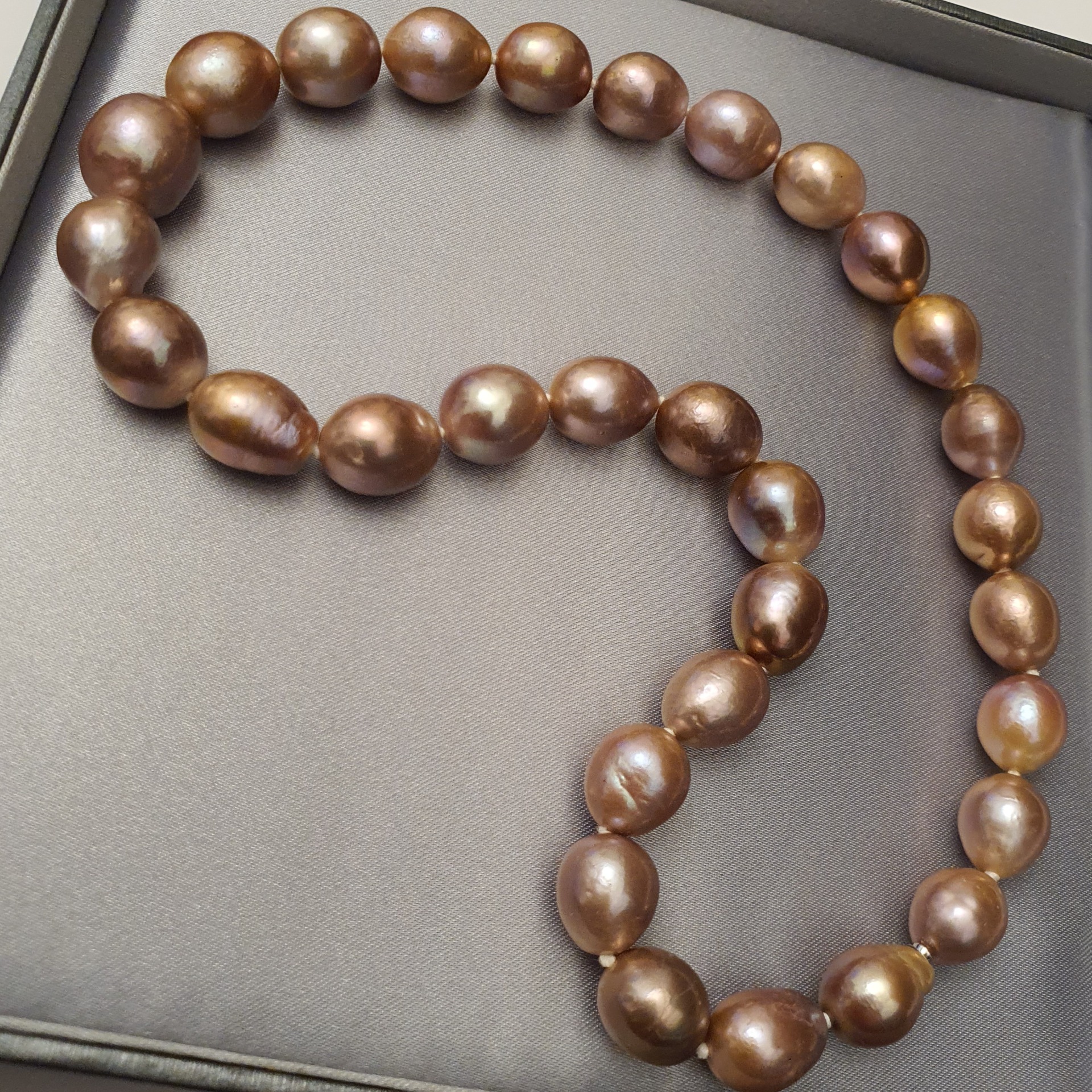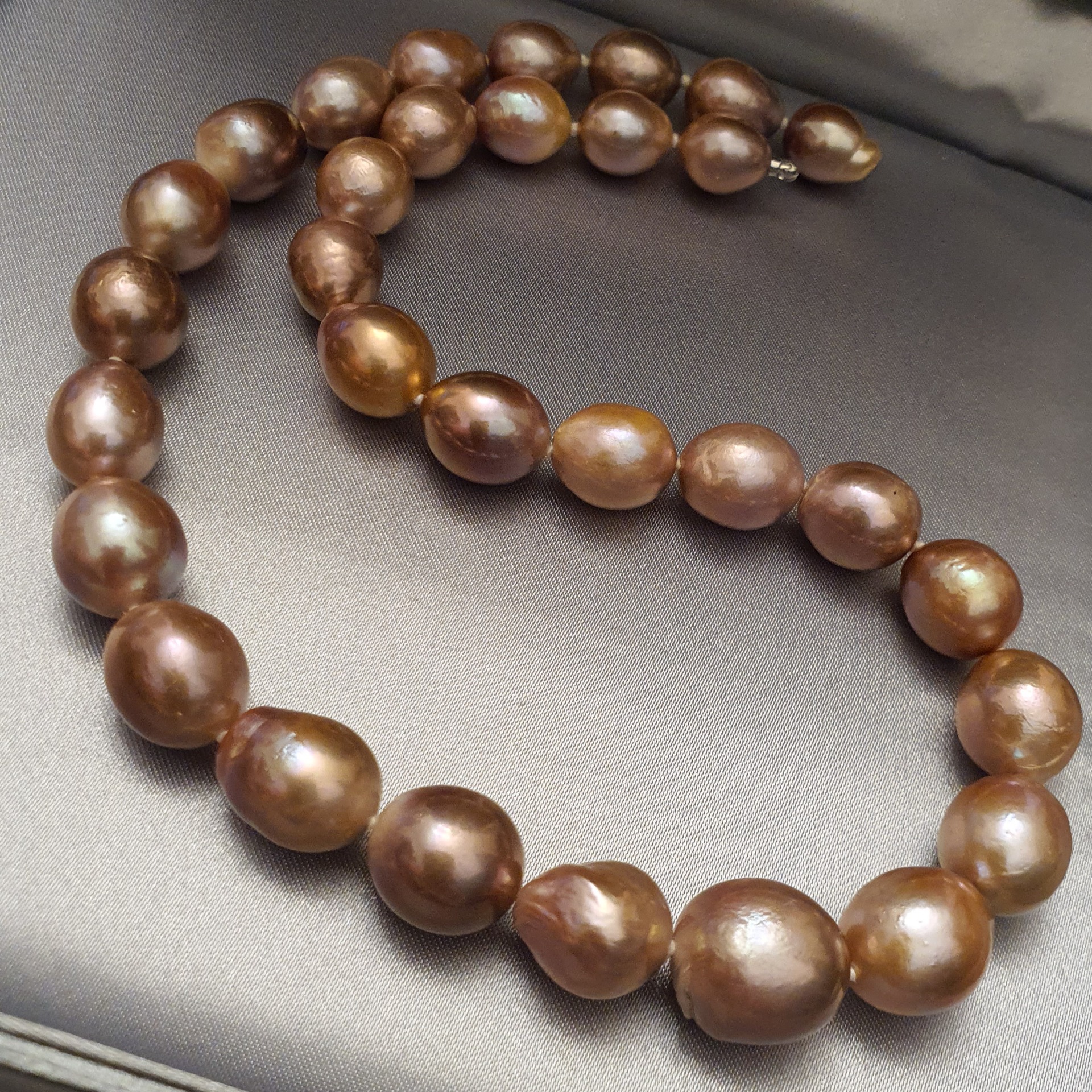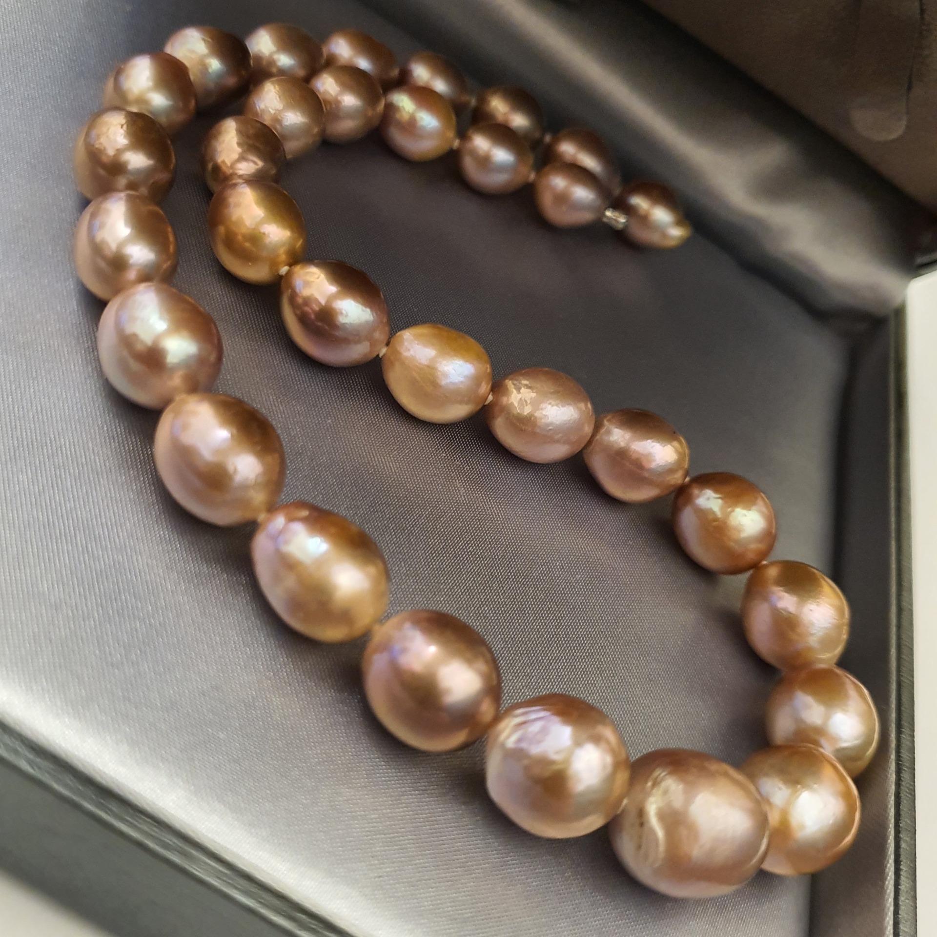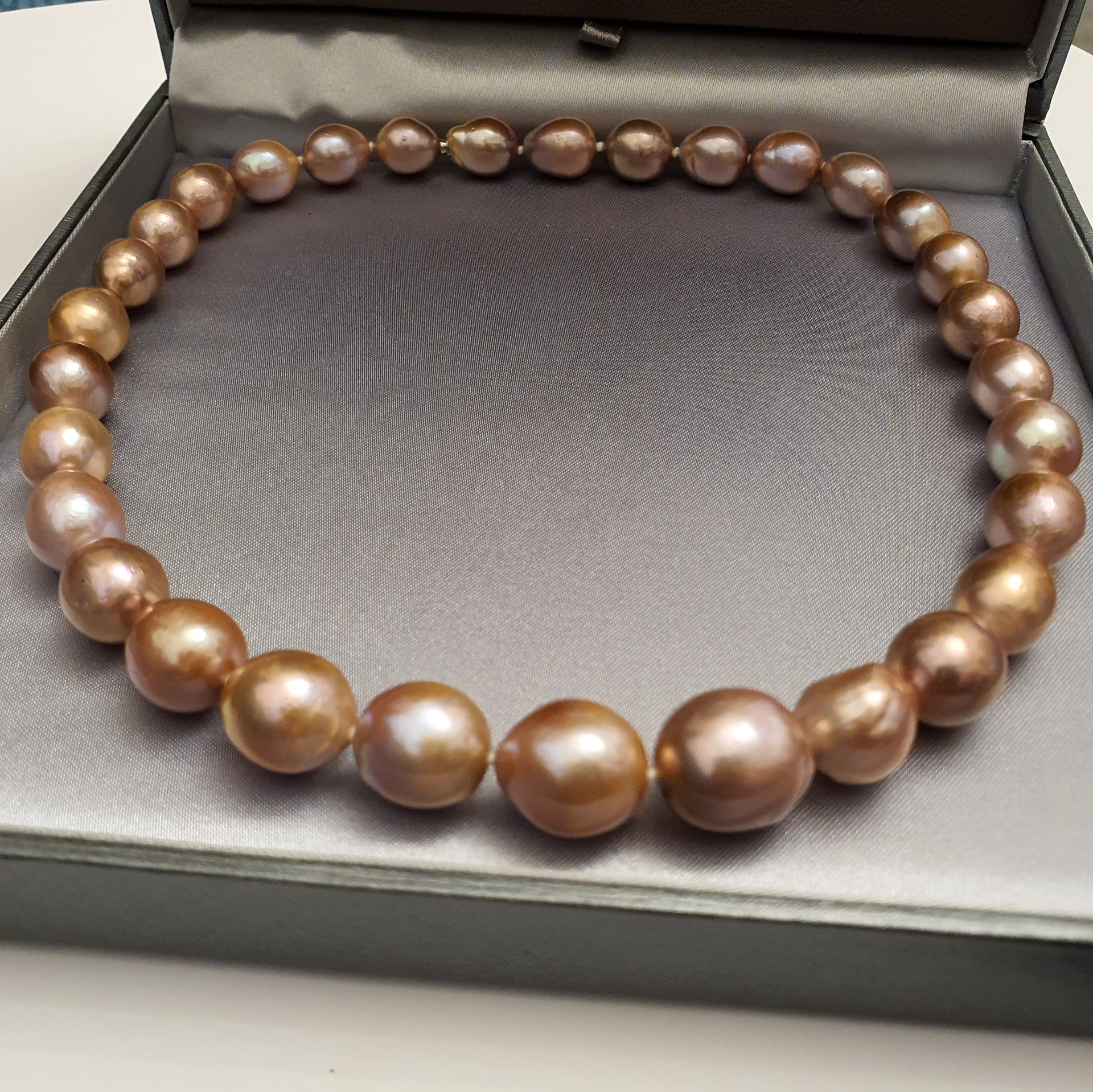 frumos colier perle naturale Edison, cu luciu foarte bun, cu cateva imperfectiuni naturale, perle ovale-baroc cu dimensiuni de la 15.2 x 14mm la 11.5 x 10.3mm, cu inchizatoare ascunsa din aur alb de 14k; colierul are greutatea de 70.68 grame si lungimea de 43 cm