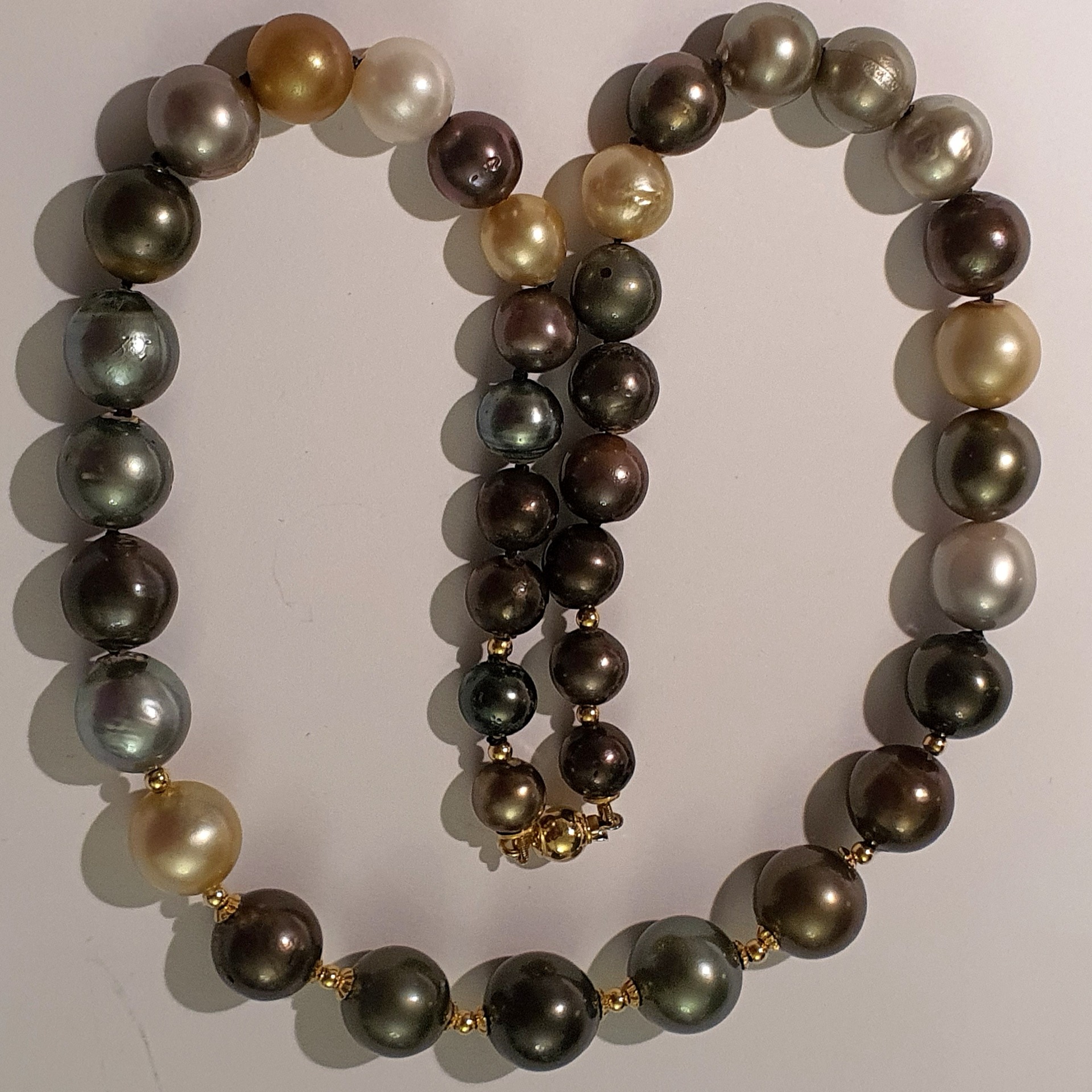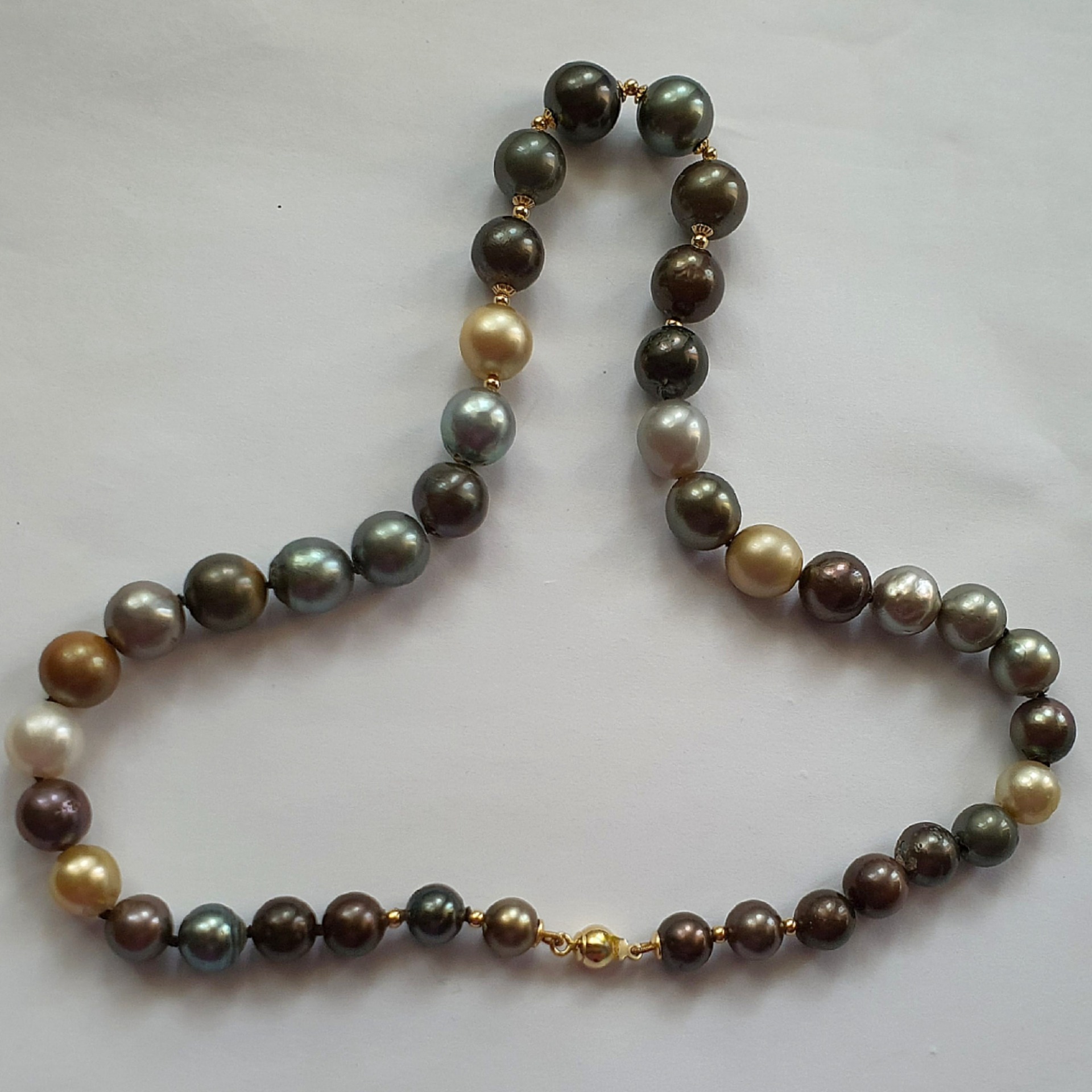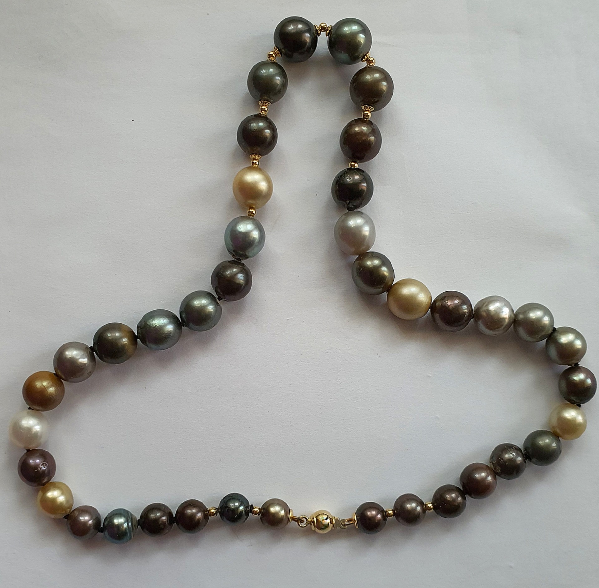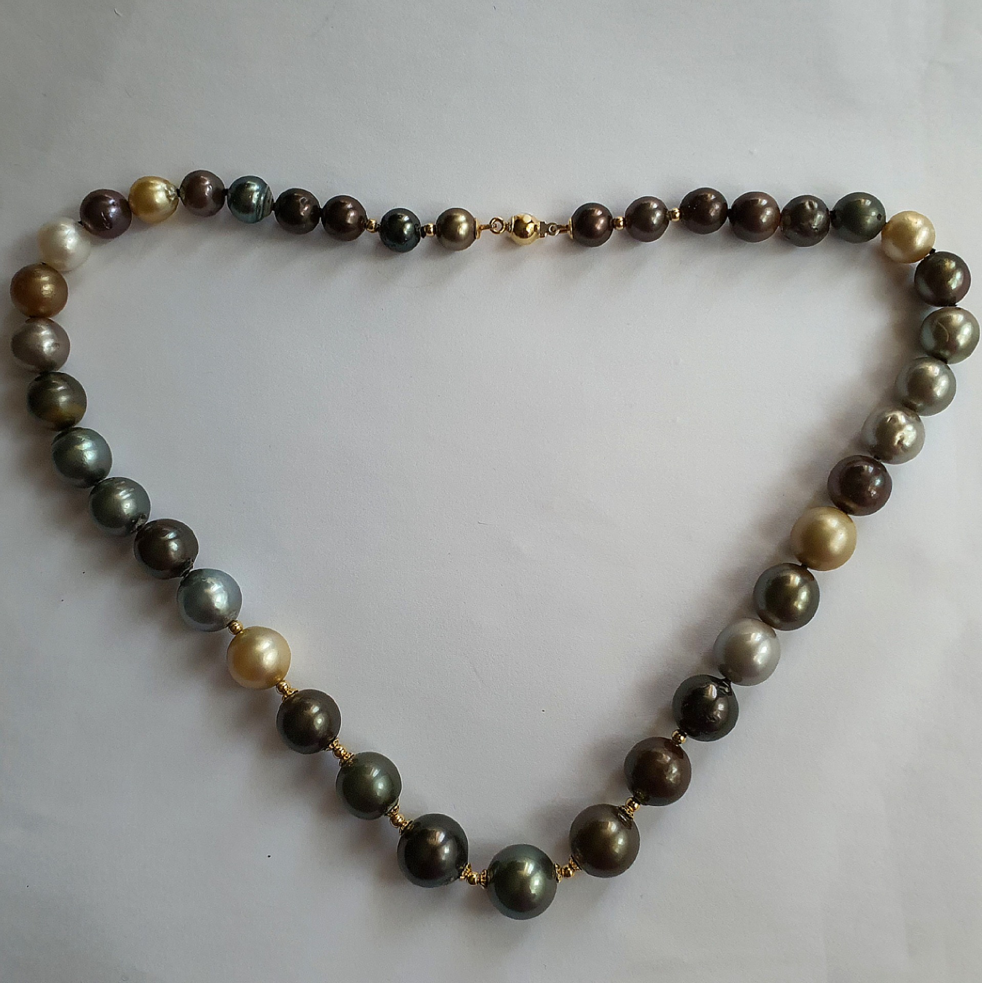 colier sic, relaxat si versatil, realizat din perle naturale multicolore tahitiene si south sea, majoritar rotunde, cu diametre de la 8 la 12.6mm, cu imperfectiuni naturale surclasate de impresia generala a colierului, cu luciu bun si foarte bun; colierul este finisat cu furnituri din aur de 18k (inchizatoare, margele, ornamente florale), cantareste 64 grame si are lungimea de 47.5 cm
