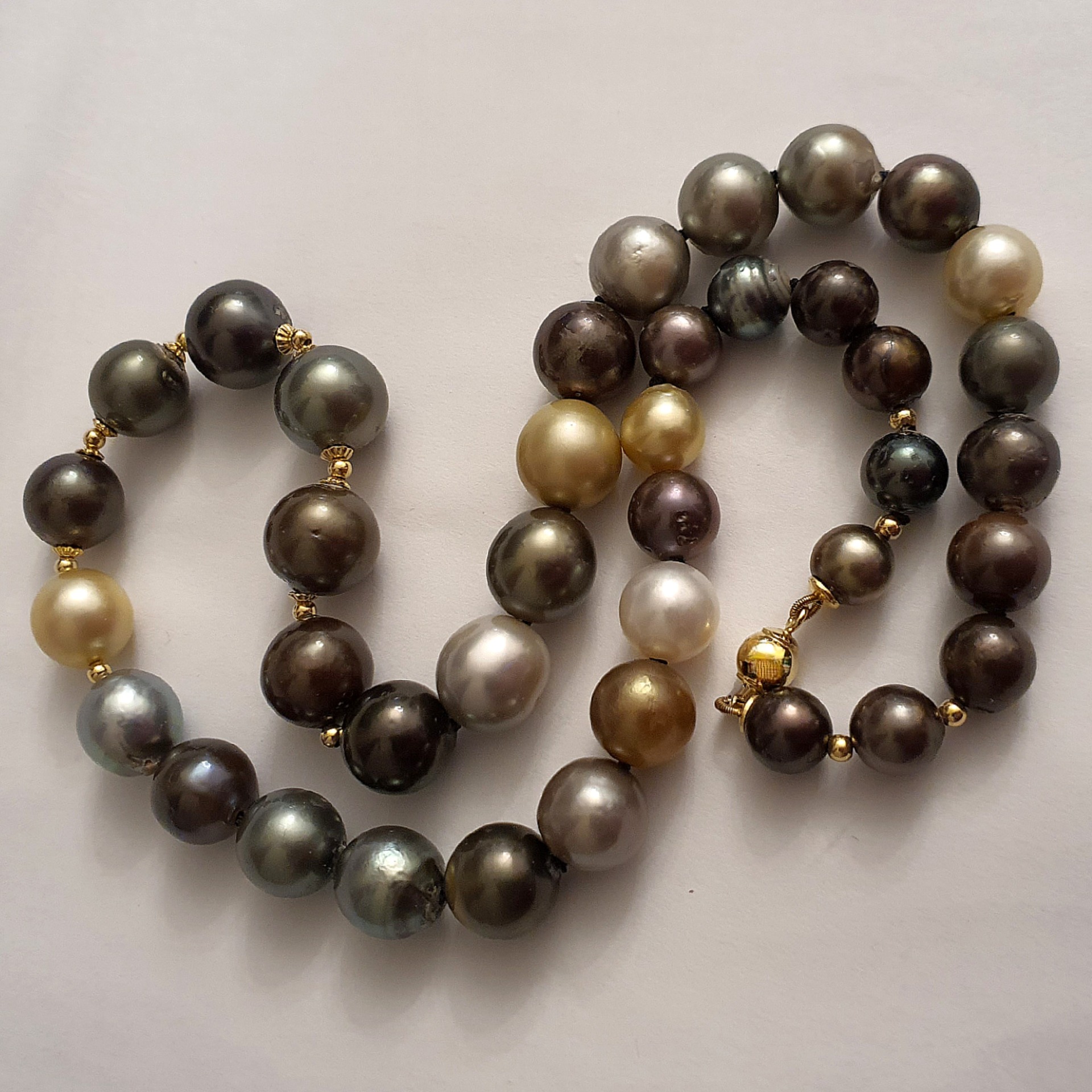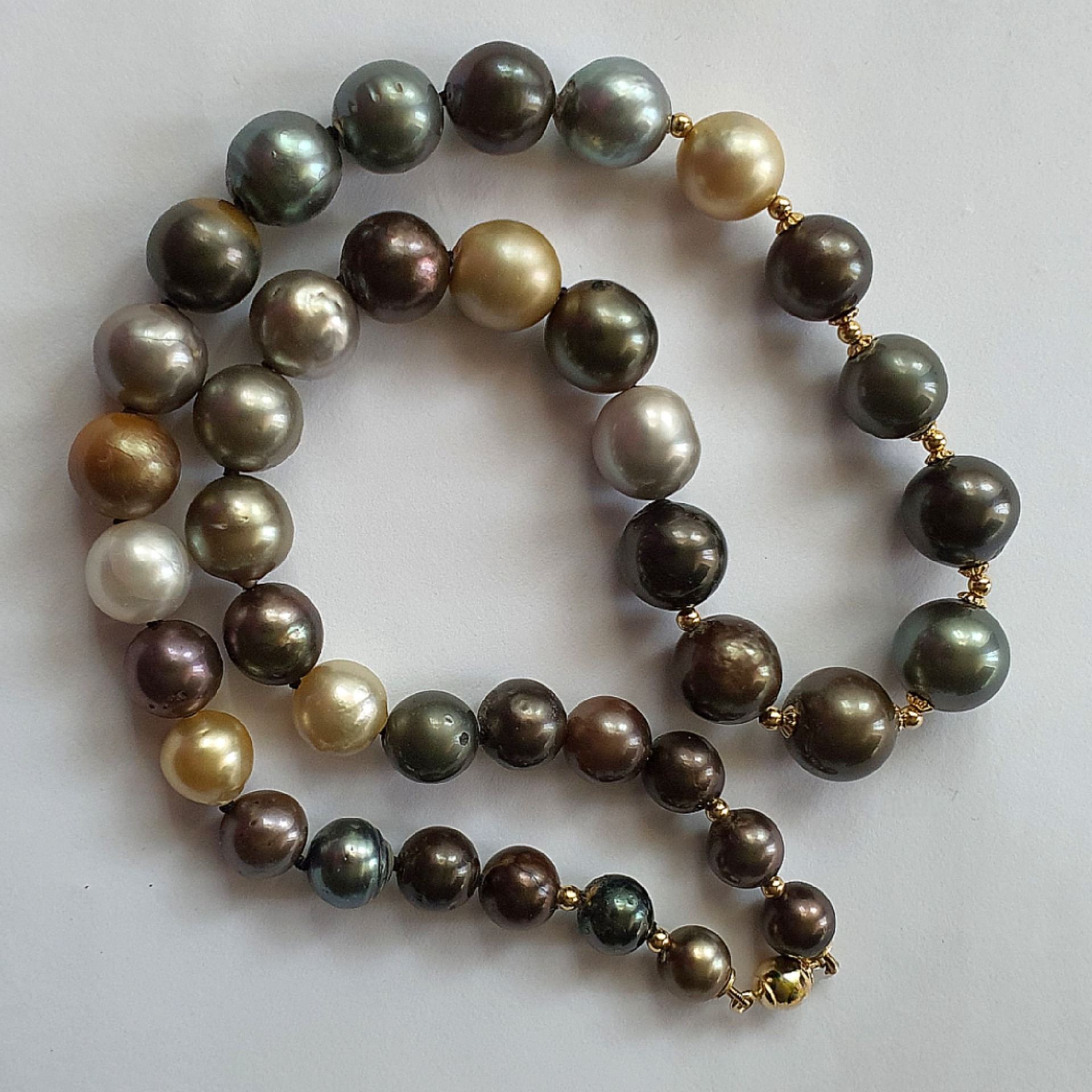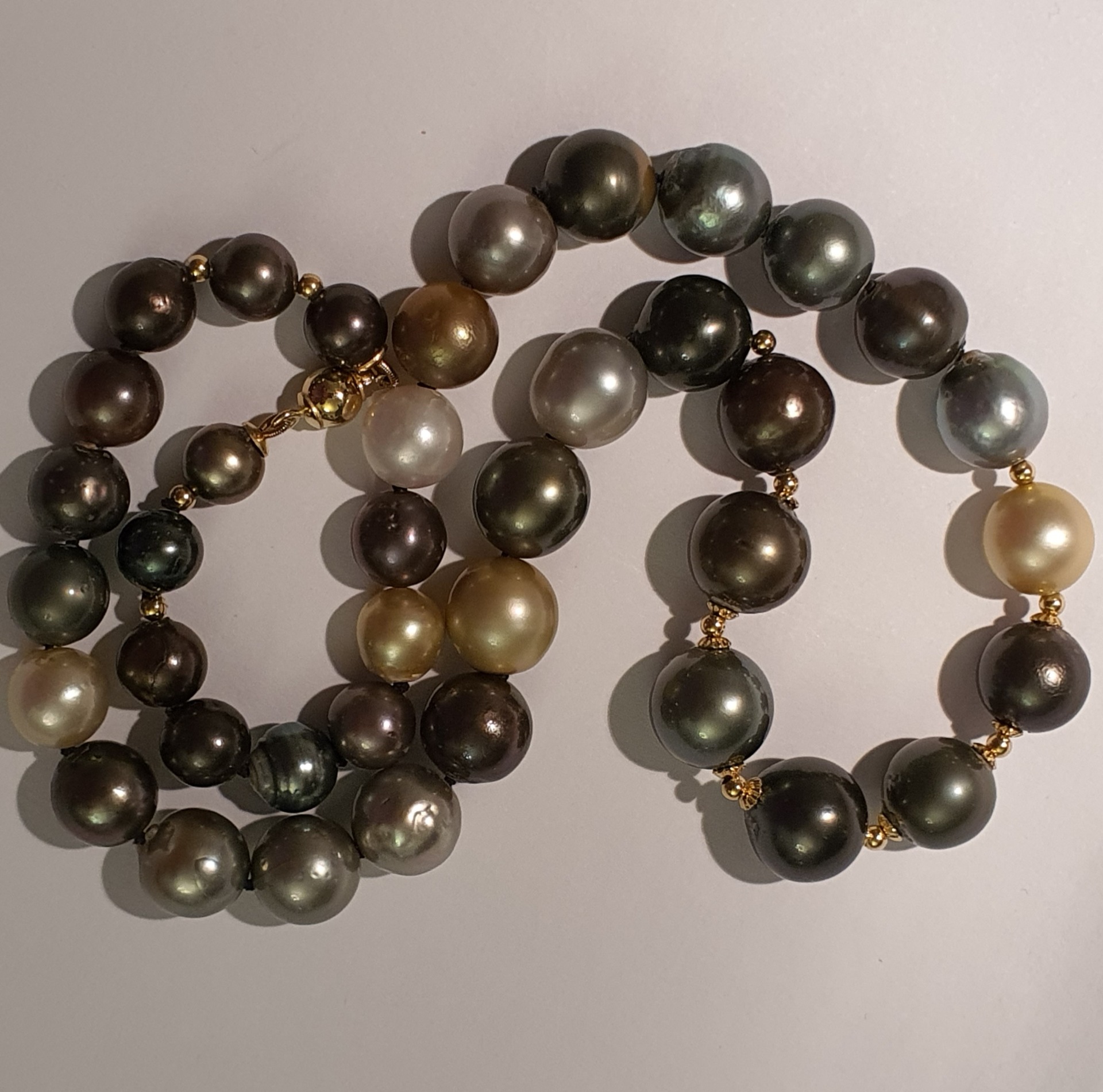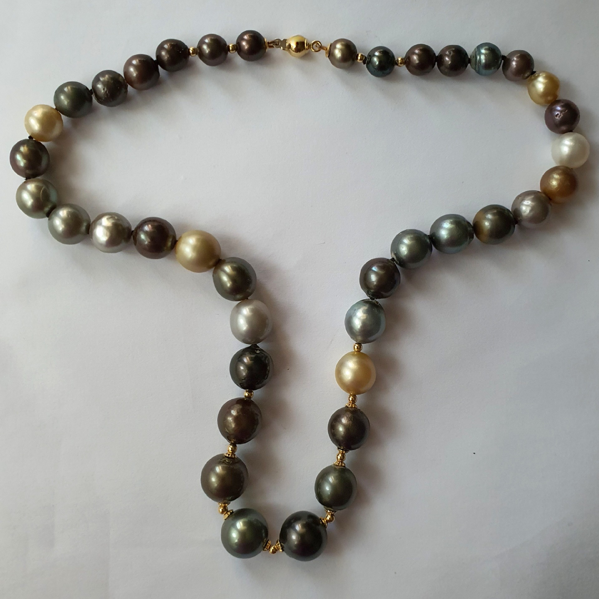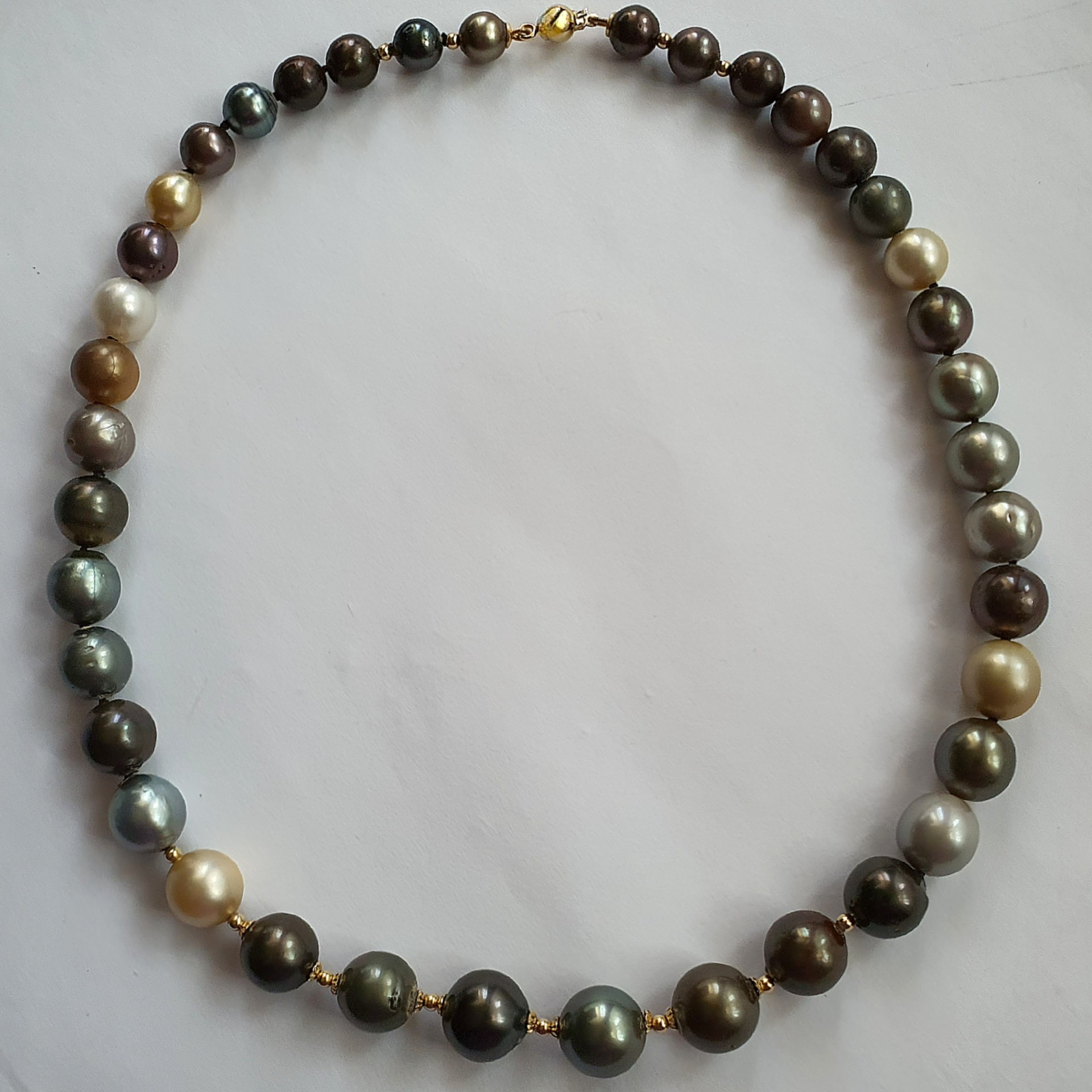 colier sic, relaxat si versatil, realizat din perle naturale multicolore tahitiene si south sea, majoritar rotunde, cu diametre de la 8 la 12.6mm, cu imperfectiuni naturale surclasate de impresia generala a colierului, cu luciu bun si foarte bun; colierul este finisat cu furnituri din aur de 18k (inchizatoare, margele, ornamente florale), cantareste 64 grame si are lungimea de 47.5 cm