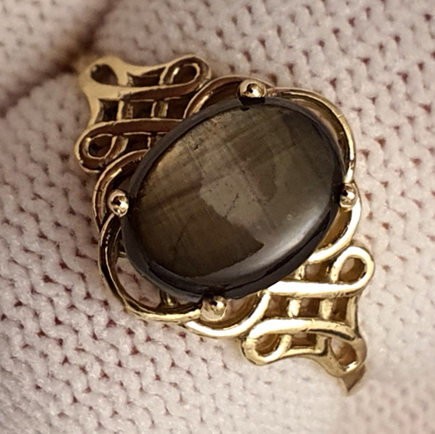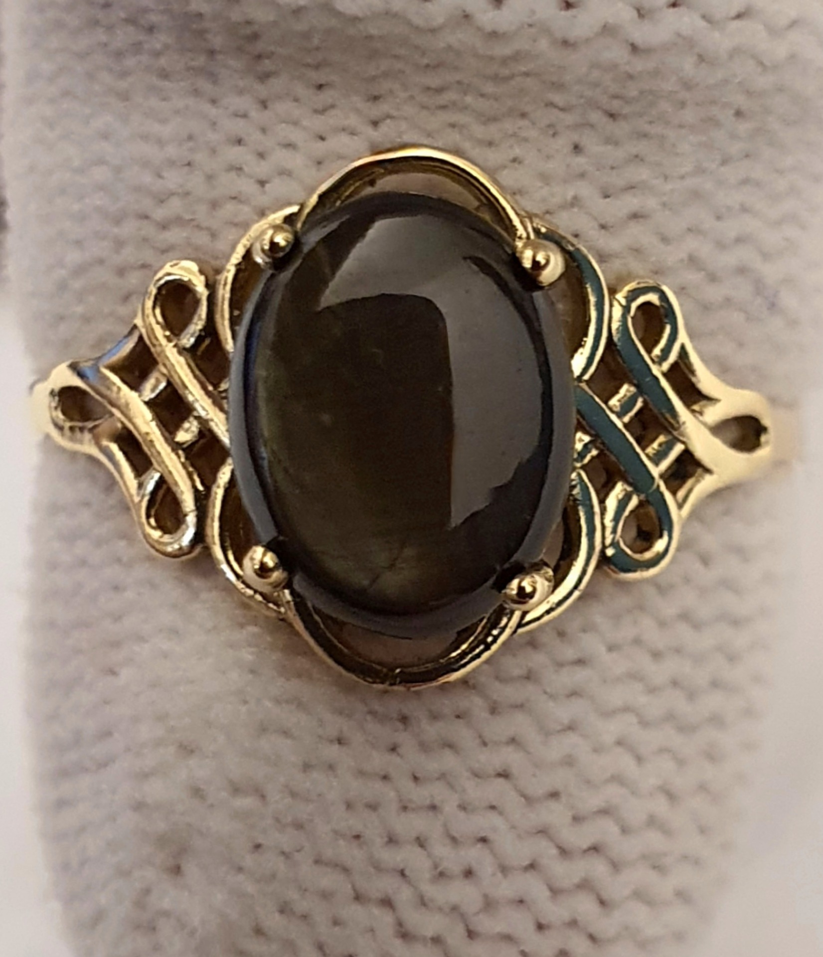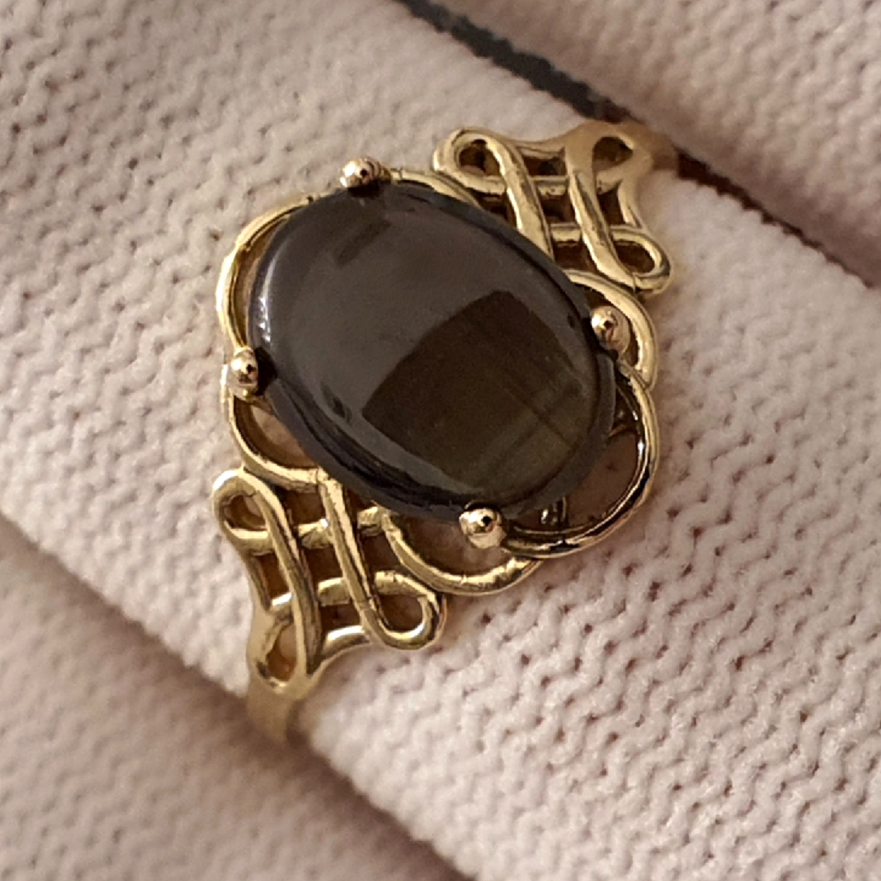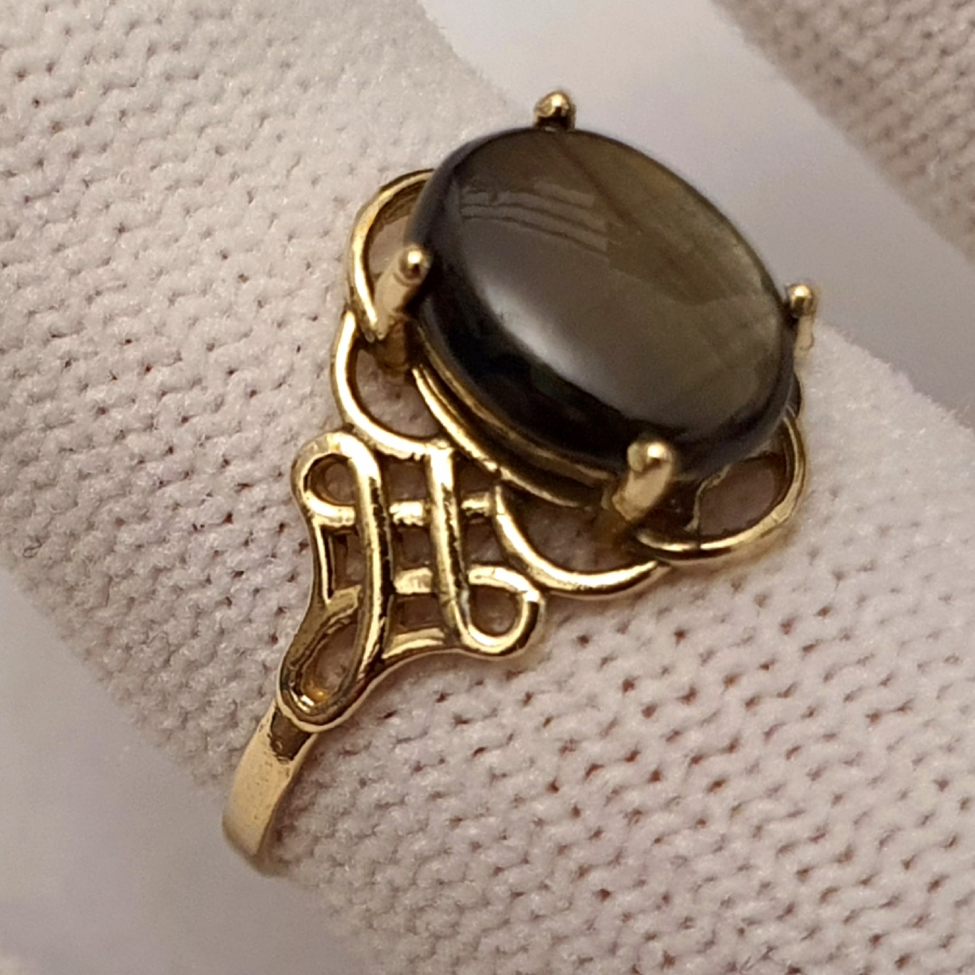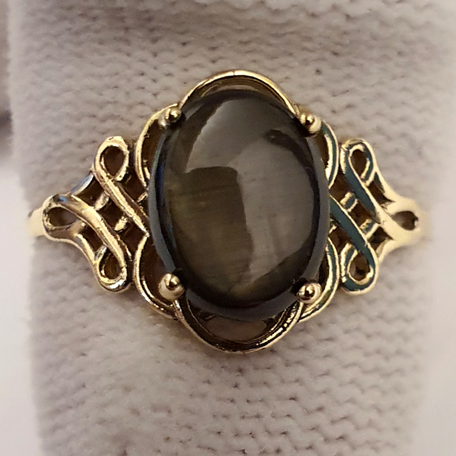 frumos inel aur galben 14k, marimea 60.5, in greutate de 2.65 grame, ornat cu un safir natural cu chatoianta puternica, caboson oval de 10x8mm si 2.485ct