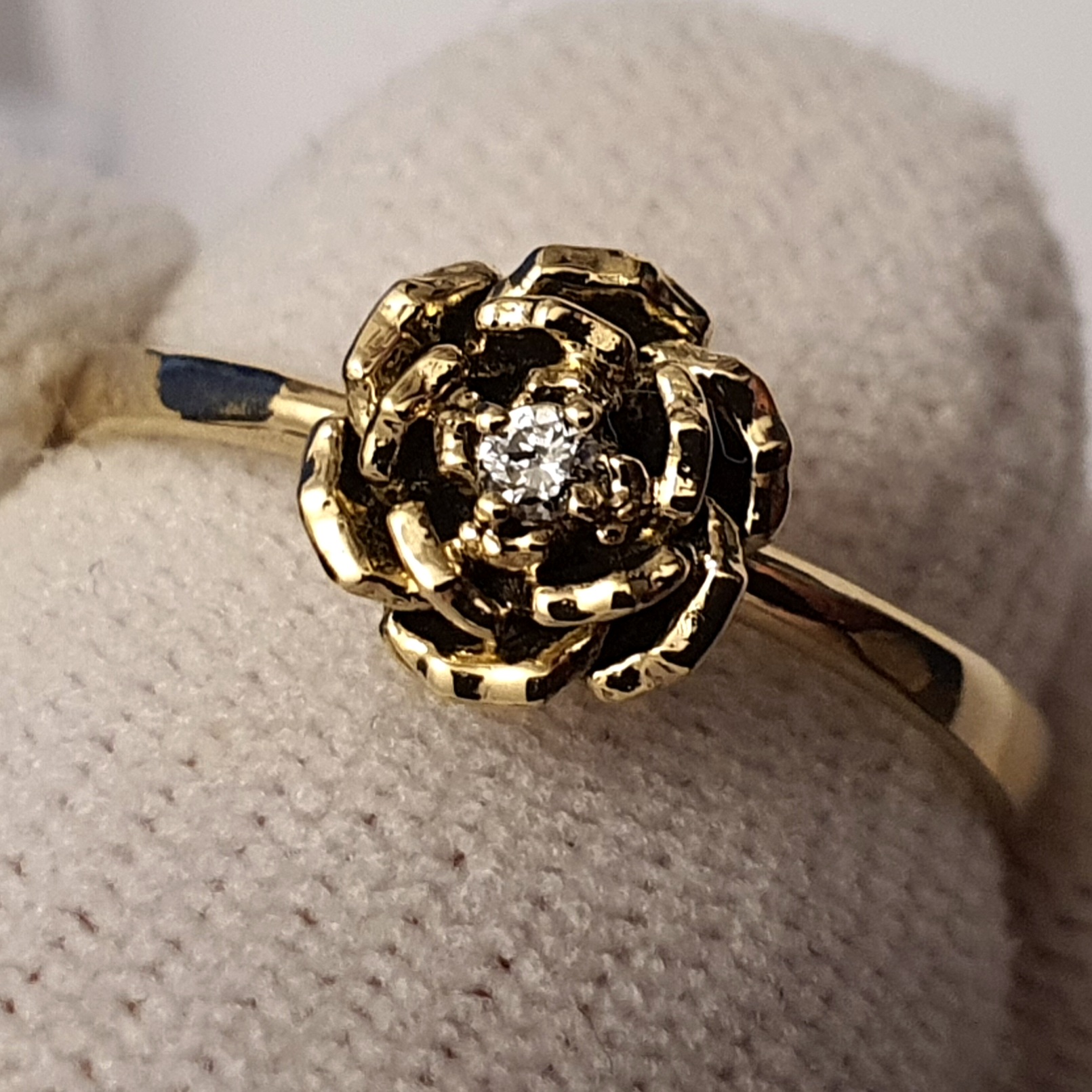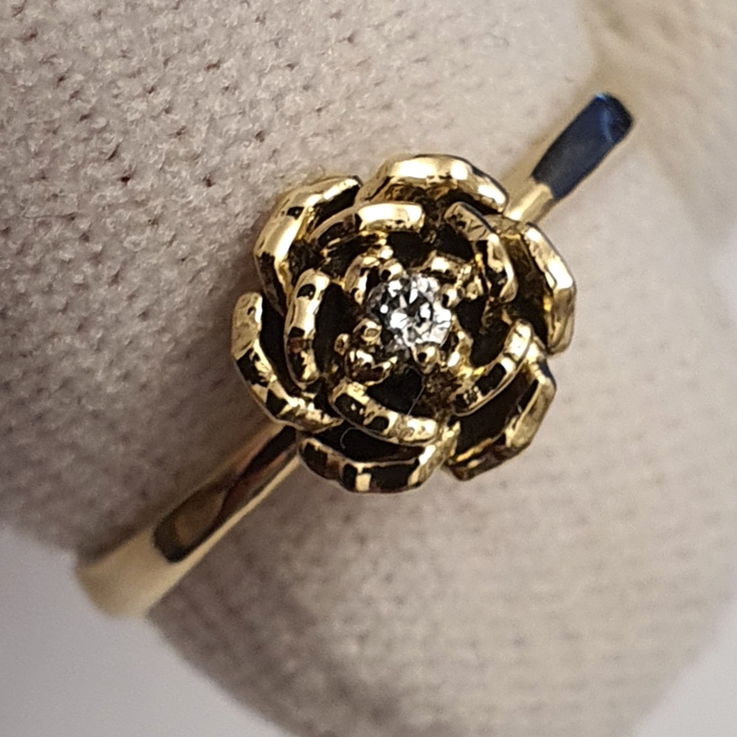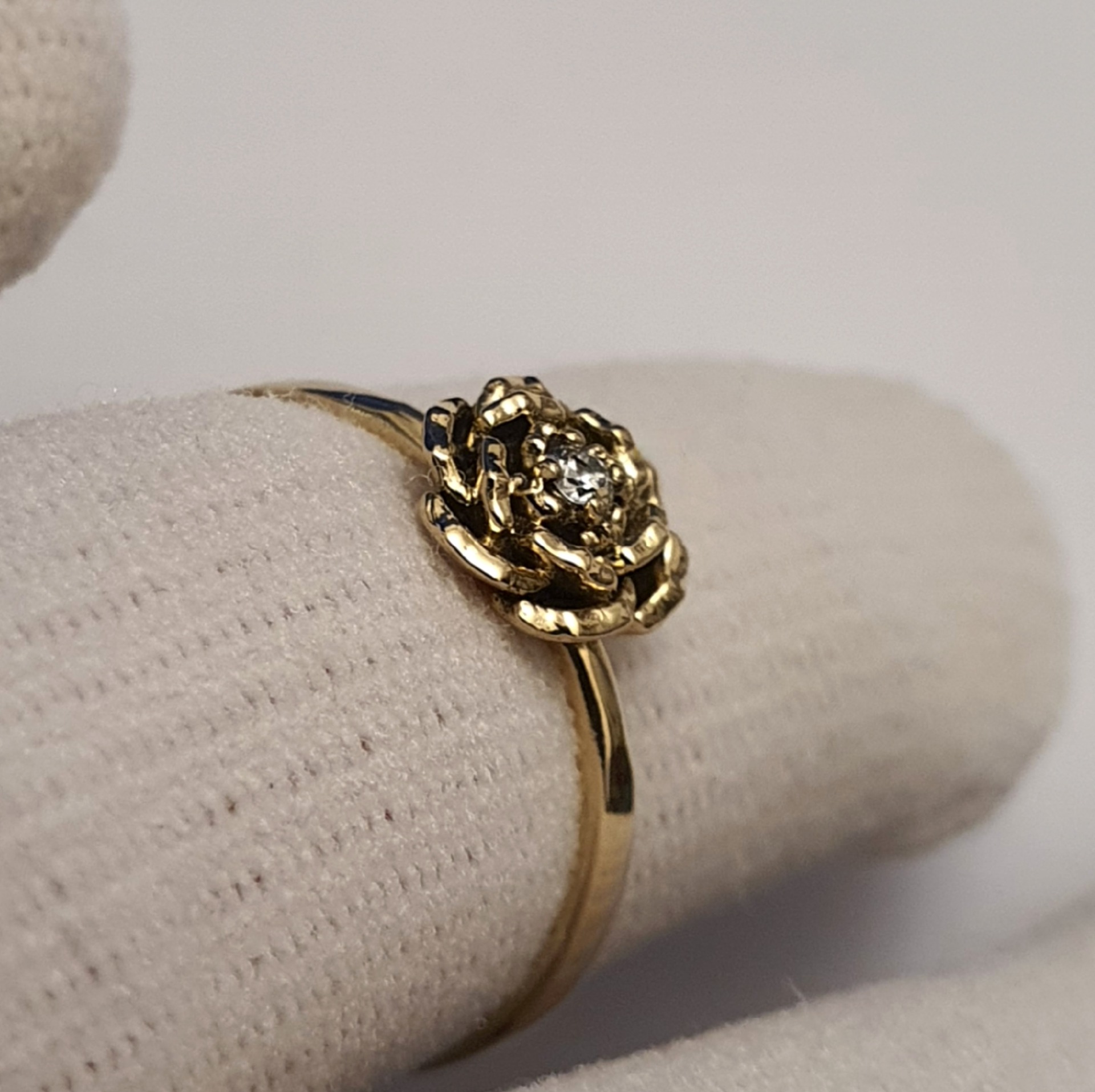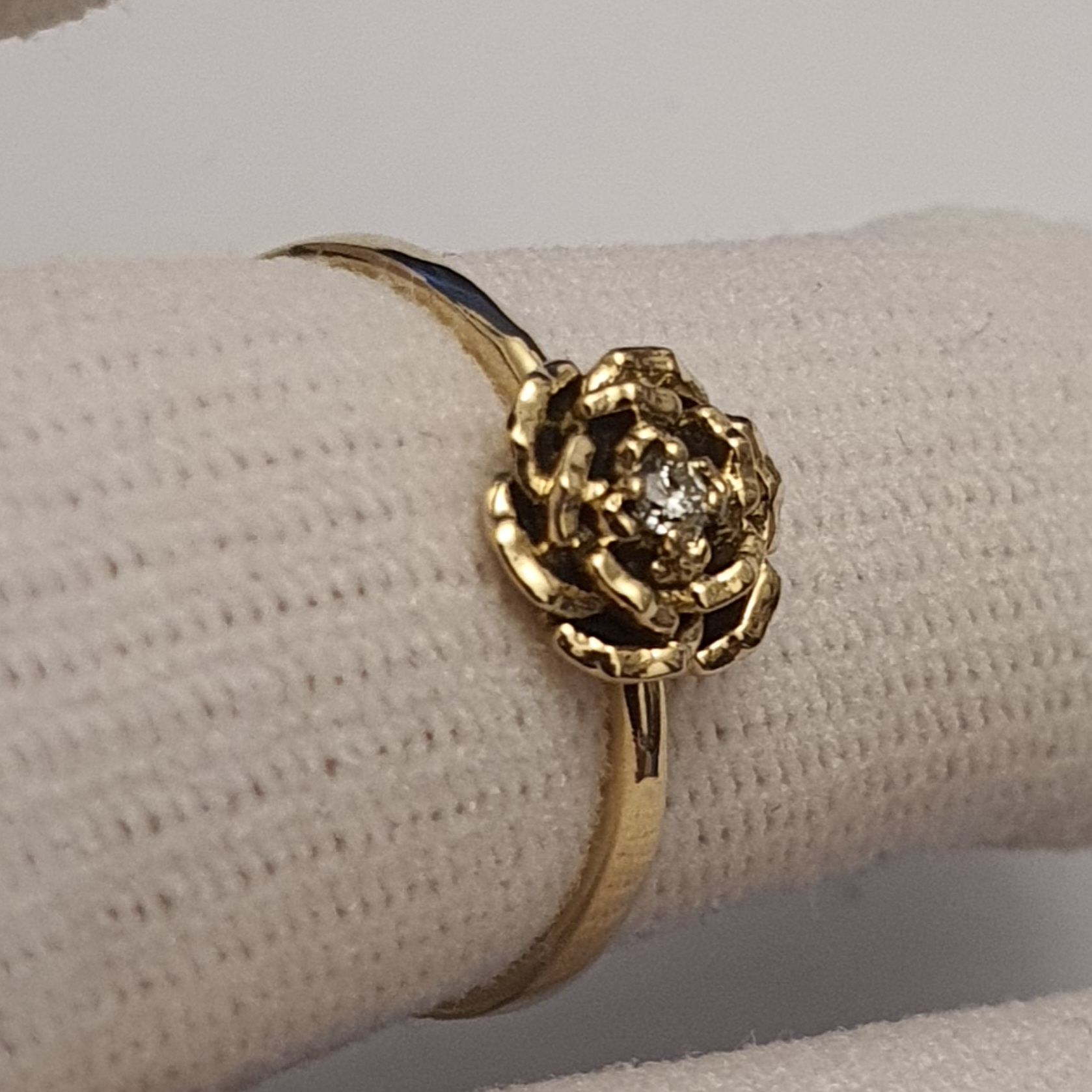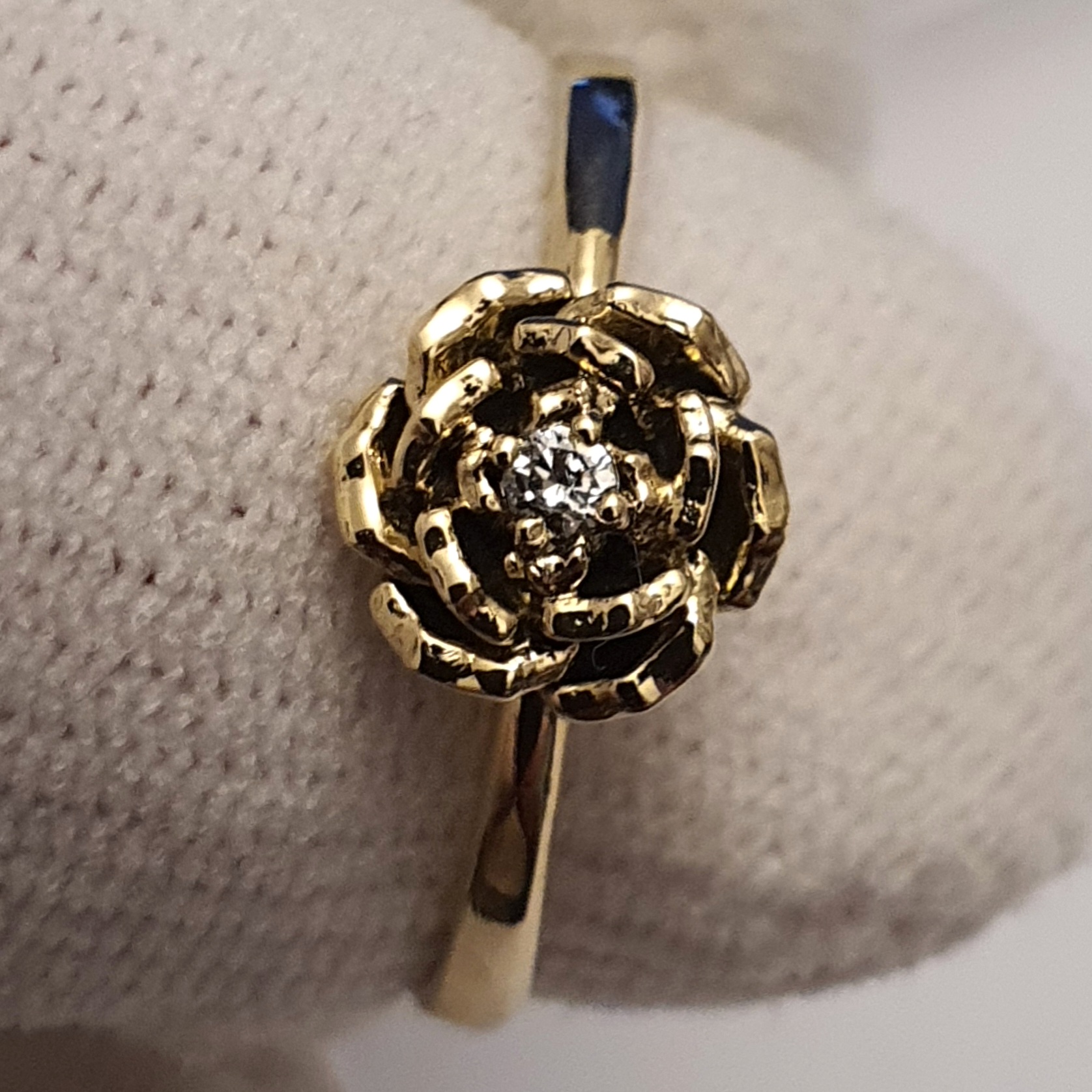 inel aur galben 14k, marimea 57, in greutate de 2.50 grame, floare ornata cu un diamant natural de 0.03ct, 2mm, calitate F-G/VS