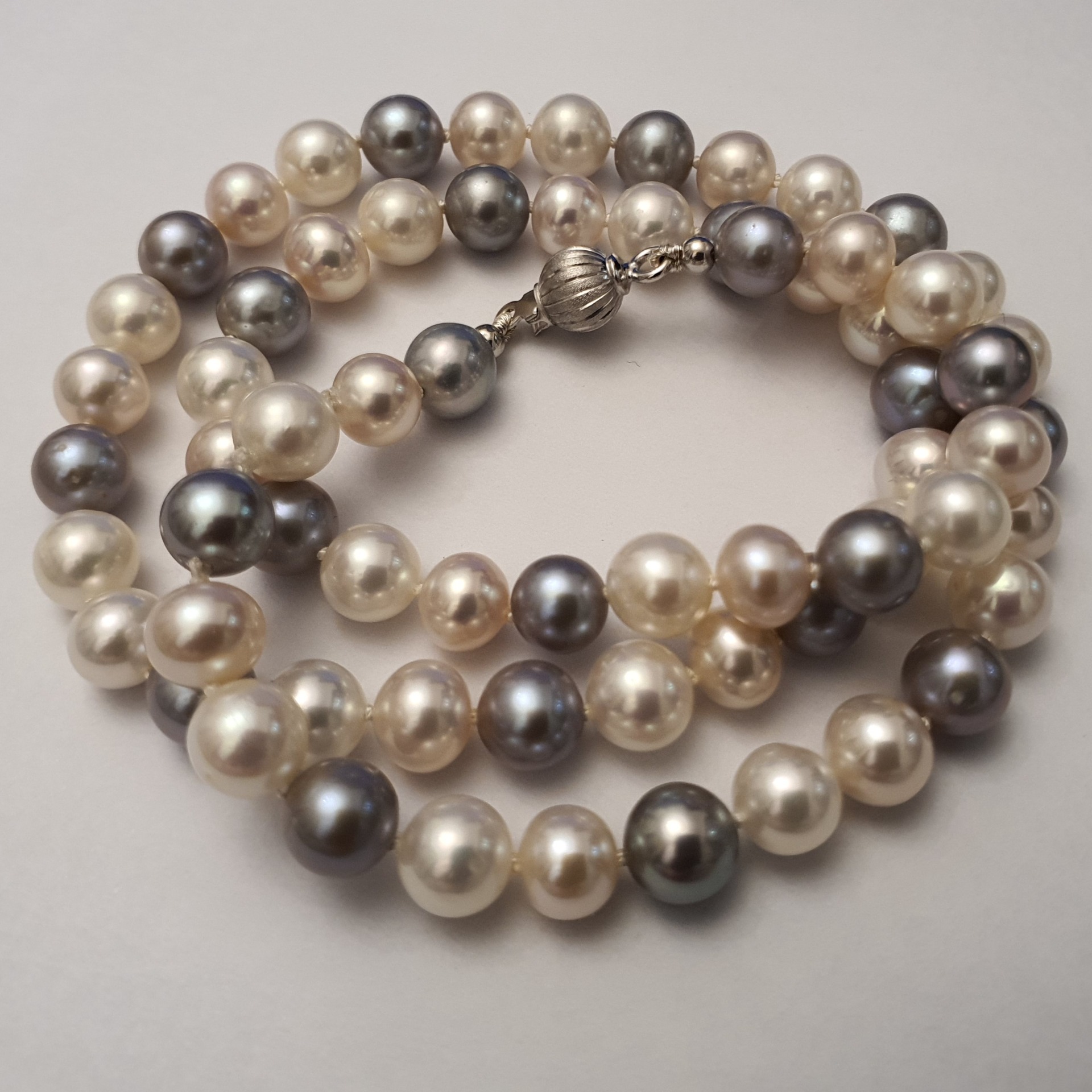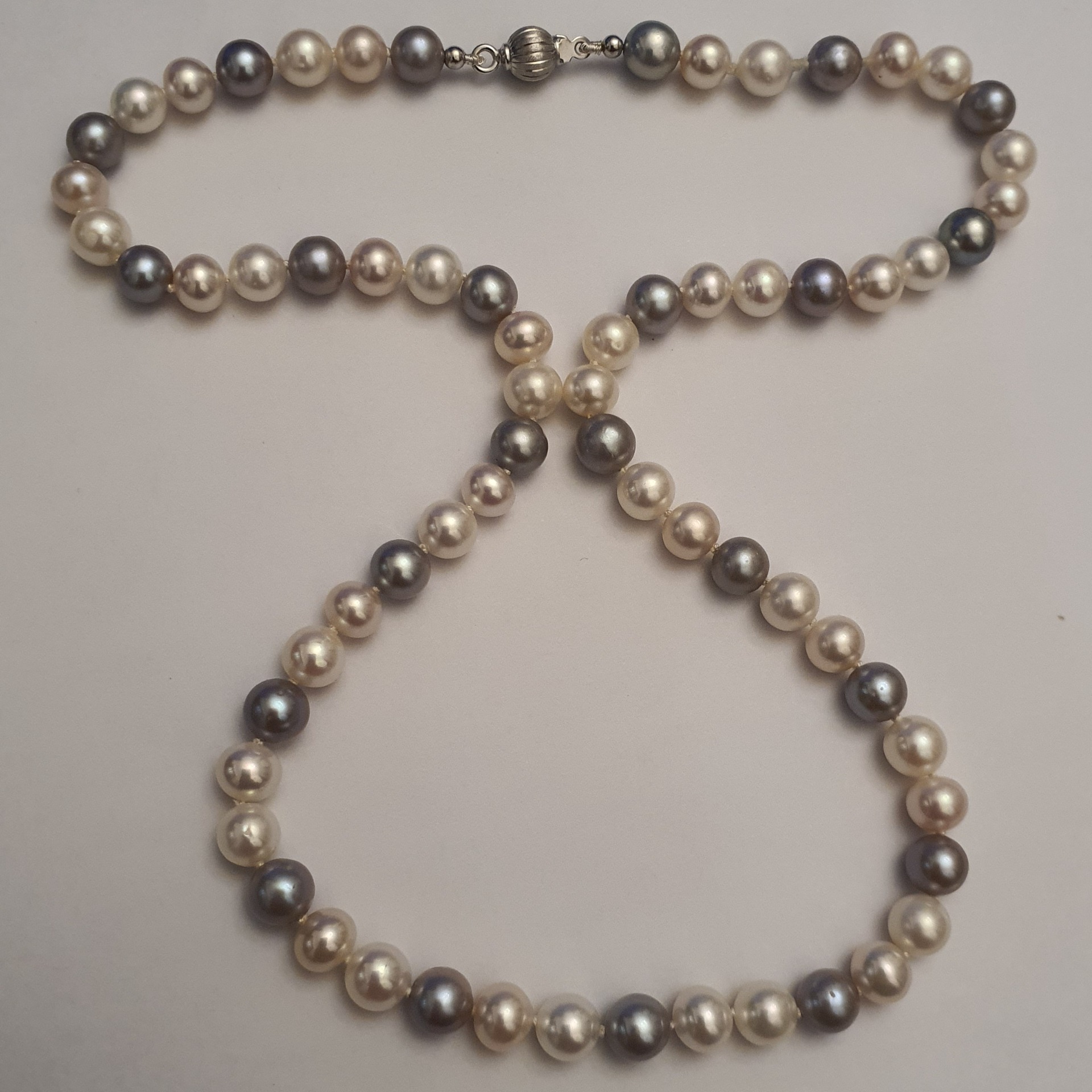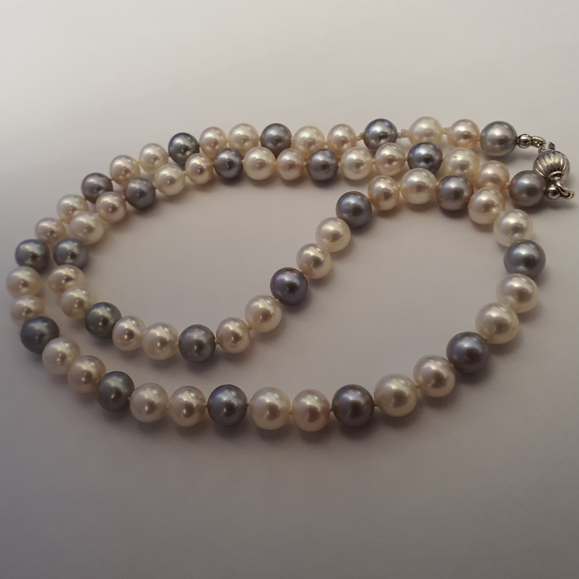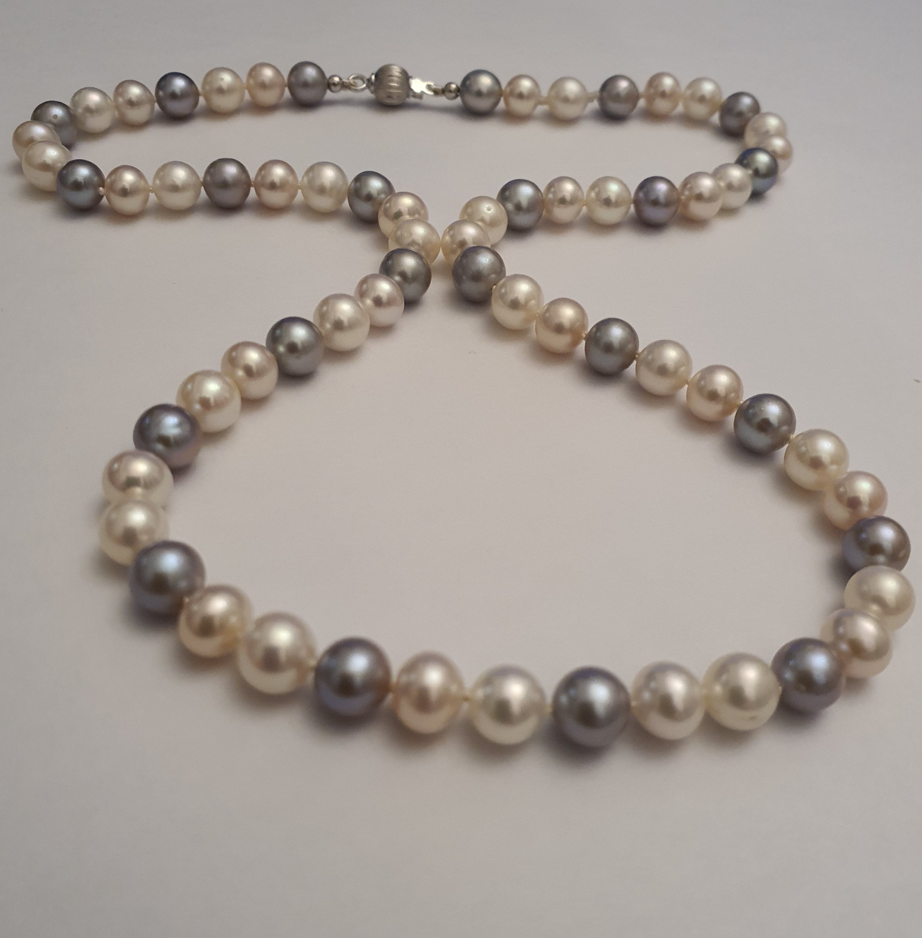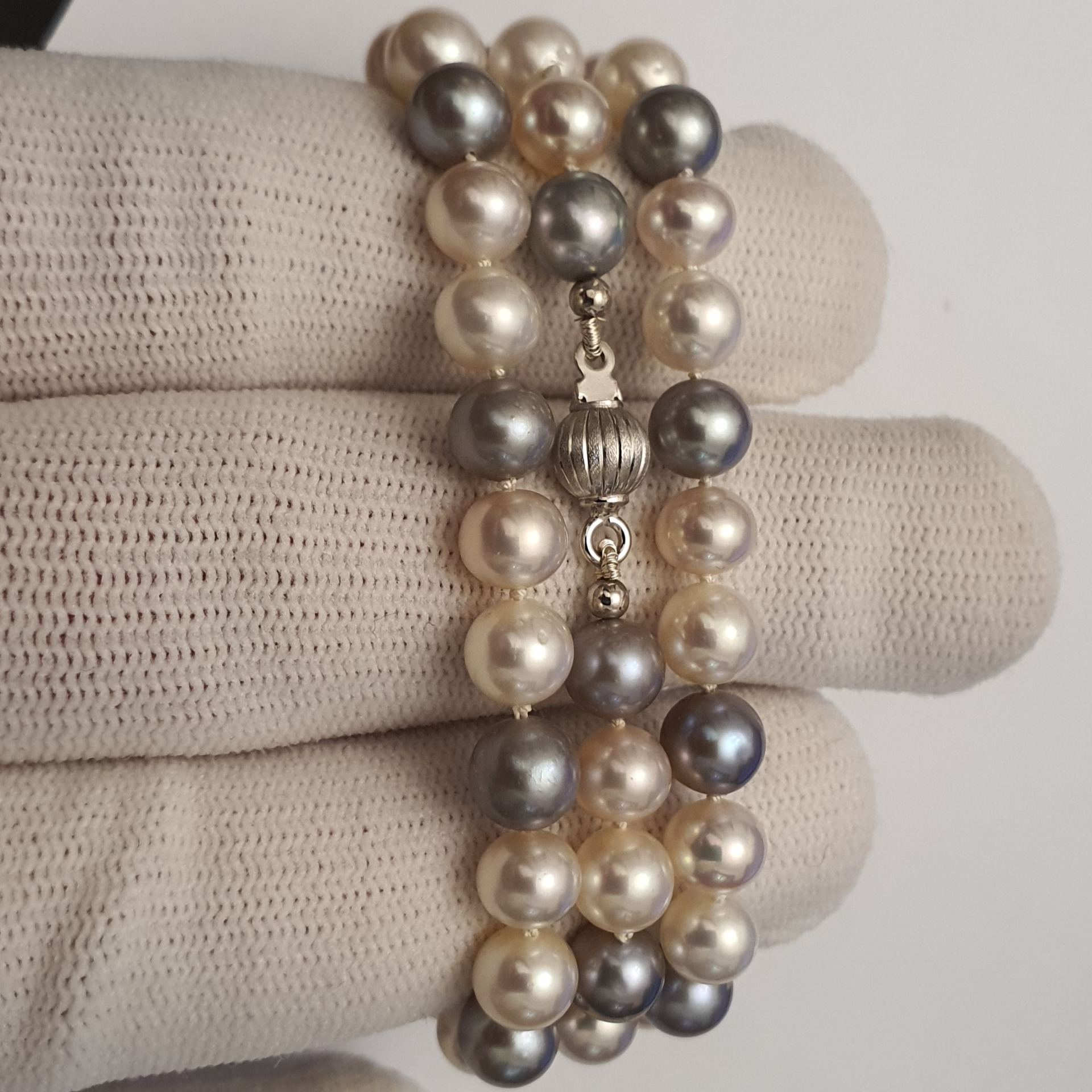 colier perle naturale de cultura de calitate superioara, lung de 45.5cm, in greutate de 23.39 grame, format din 67 perle albe si argintii, rotunde de aprox. 6-6.5mm, cu luciu excelent, cu 2 margele de 2.6mm si inchizatoare de 6mm din aur alb de 18k; este un colier remarcabil si rafinat, potrivit si pentru tinute office